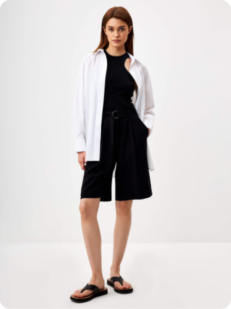 Отличный вариант, если в офисе нужно соблюдать не строгий, но все же дресс-код. Костюмные шорты хорошо смотрятся с рубашками с коротким рукавом и свободными пиджаками, это доказала еще Джулия Робертс в «Красотке». Но составят достойную компанию и более расслабленным вещам — футболкам, коротким топам и майкам на тонких бретелях. А еще советуем примерить комбо из тренча, плетеных сандалий и строгих шорт: смотрится одновременно изящно и очень богемно.