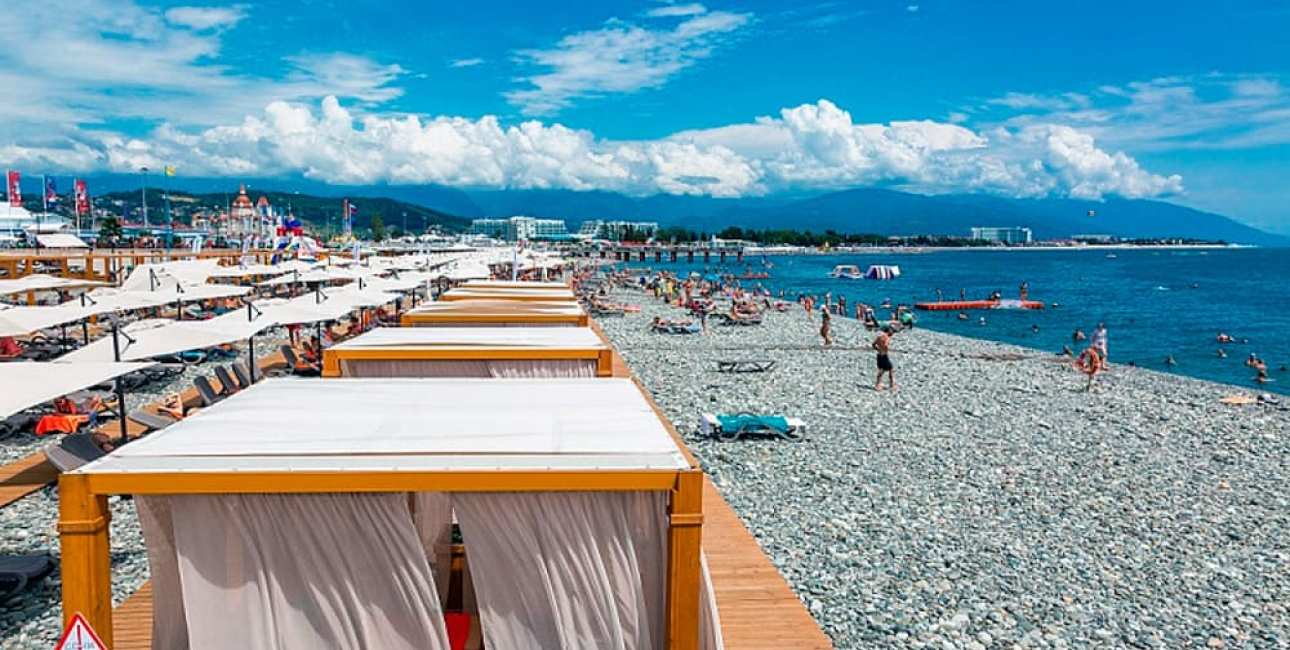 Самый большой пляж без волнорезов в Сочи: его территория составляет 1 га. Традиционные шезлонги (600 р.), бунгало (5000 р.) и рестораны дополняют зеленый сквер, закатный амфитеатр, где устраивают концерты, бесплатные групповые занятия спортом, воркаут-площадка и детский центр с батутами, лабиринтами, горками, аквагримом и бассейном с шариками.