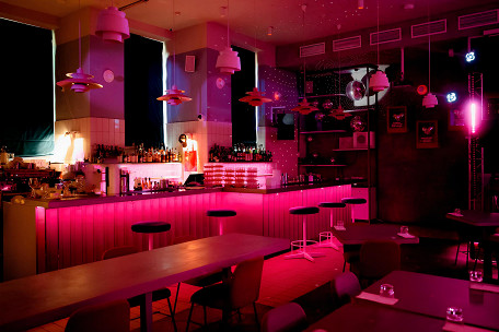 Томный клуб на Патриках, куда едут танцевать и знакомиться. Посетители в соответствующих образах: приветствуются блестки и пайетки, каблуки и укладки, мелькают брендовые сумки и смоки-айc. Интерьер под стать: густой розовый неон, зеркала и плюшевые диванчики.