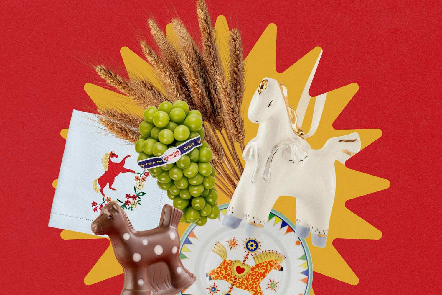 Что любят лошади? Зеленую травку, которую можно пощипать, хрустящие яблоки и выпас на лугу. Тематический декор стола можно сделать растительным: поставить сухоцветы в вазы, разложить яблоки и колосья пшеницы. Свежую траву ищите в зоомагазинах — если расставить пучки в небольшие горшки на столе, получится неизбитый фуд-стайлинг с намеком на скорую весну.