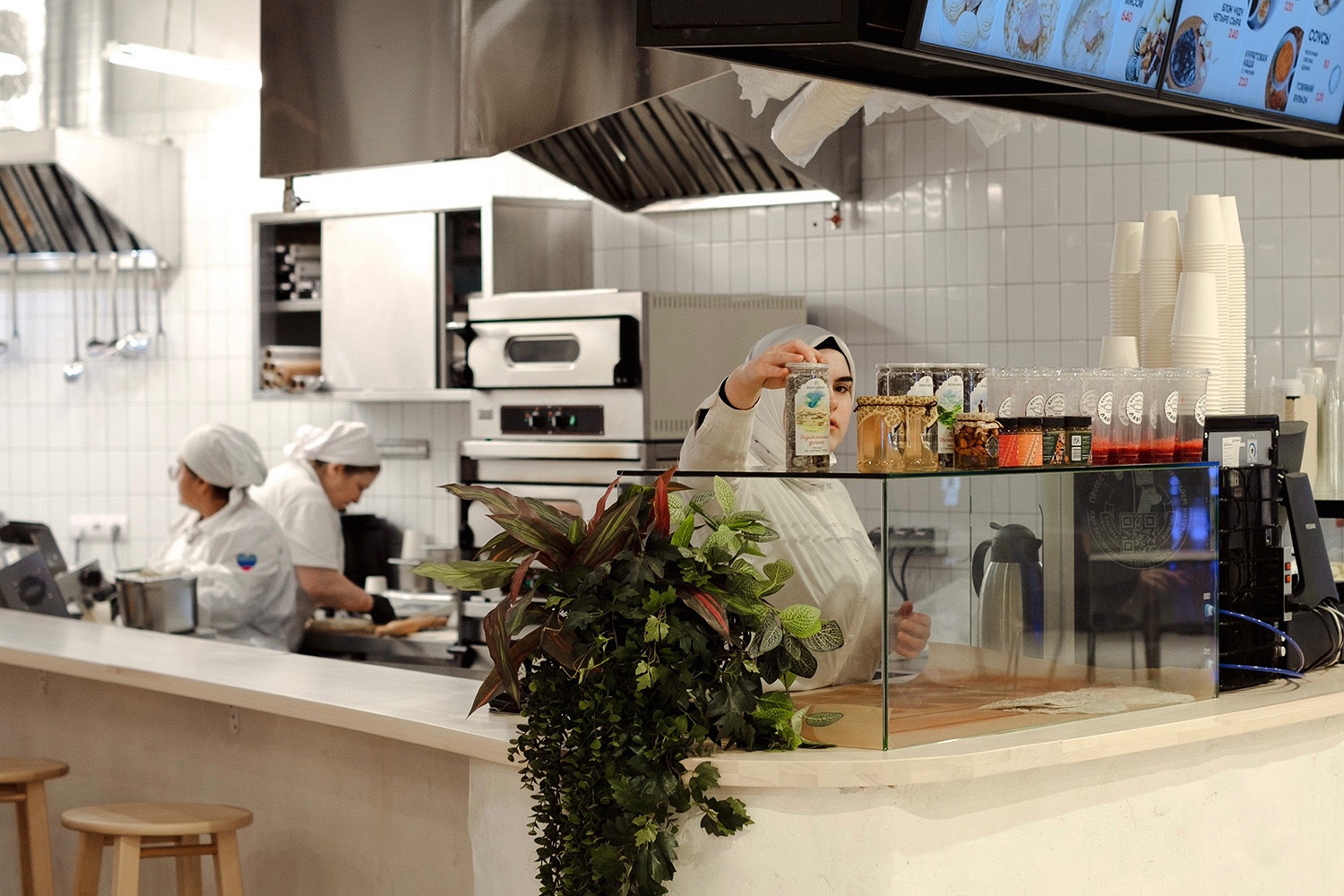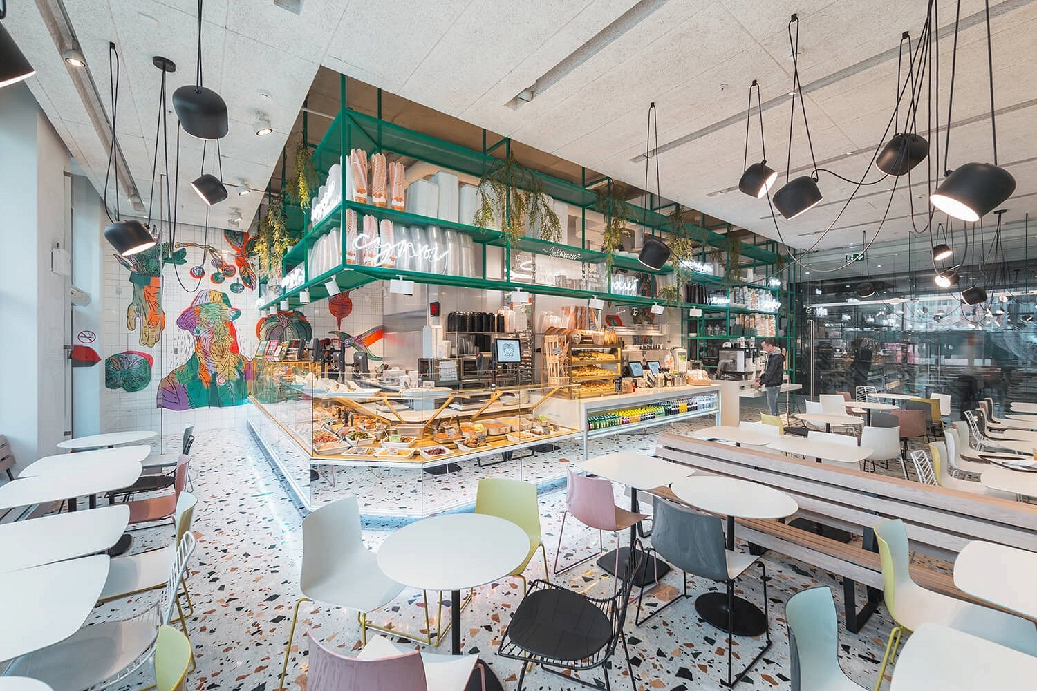 Самая домашняя версия — плотный куриный бульон с зеленью и яйцом. Стандартная порция — 300 грамм (195 р.). Если хотите взять с собой, нужно сразу при заказе попросить перелить в стаканчик или сделать это самостоятельно на кофе-станции.