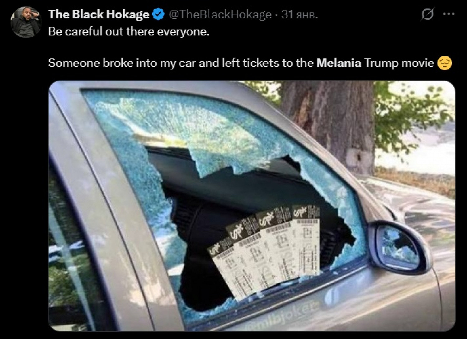 «Будьте осторожны все. Кто‑то взломал мою машину и оставил там билеты на фильм „Мелания“»