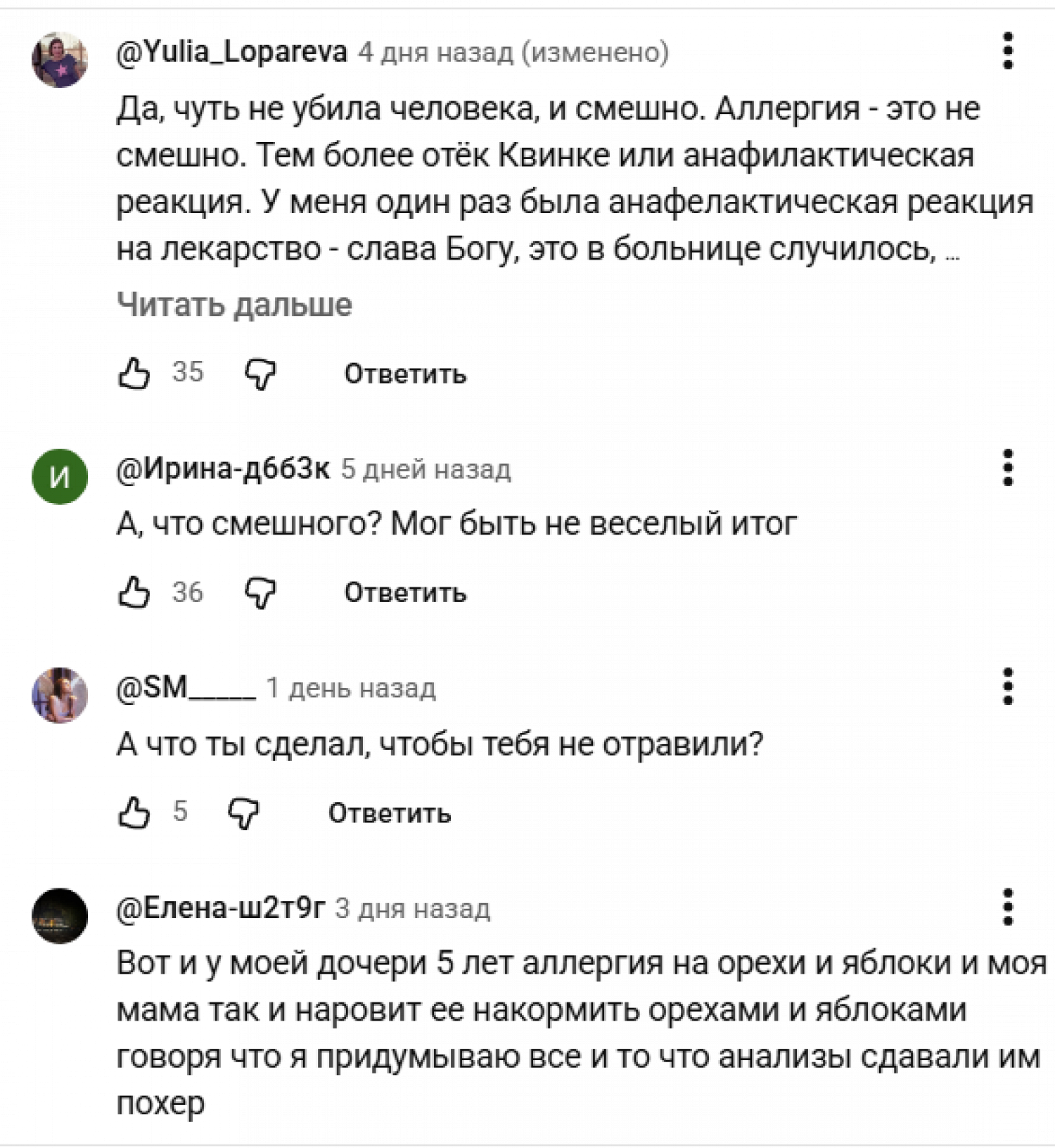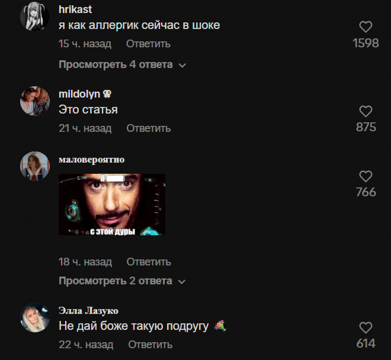 Пользовательница тиктока @dazzyvr тоже не оценила юмор ведущей. По словам девушки, недавно у нее развились перекрестные пищевые аллергии, и она «познала всю боль жизни аллергика».