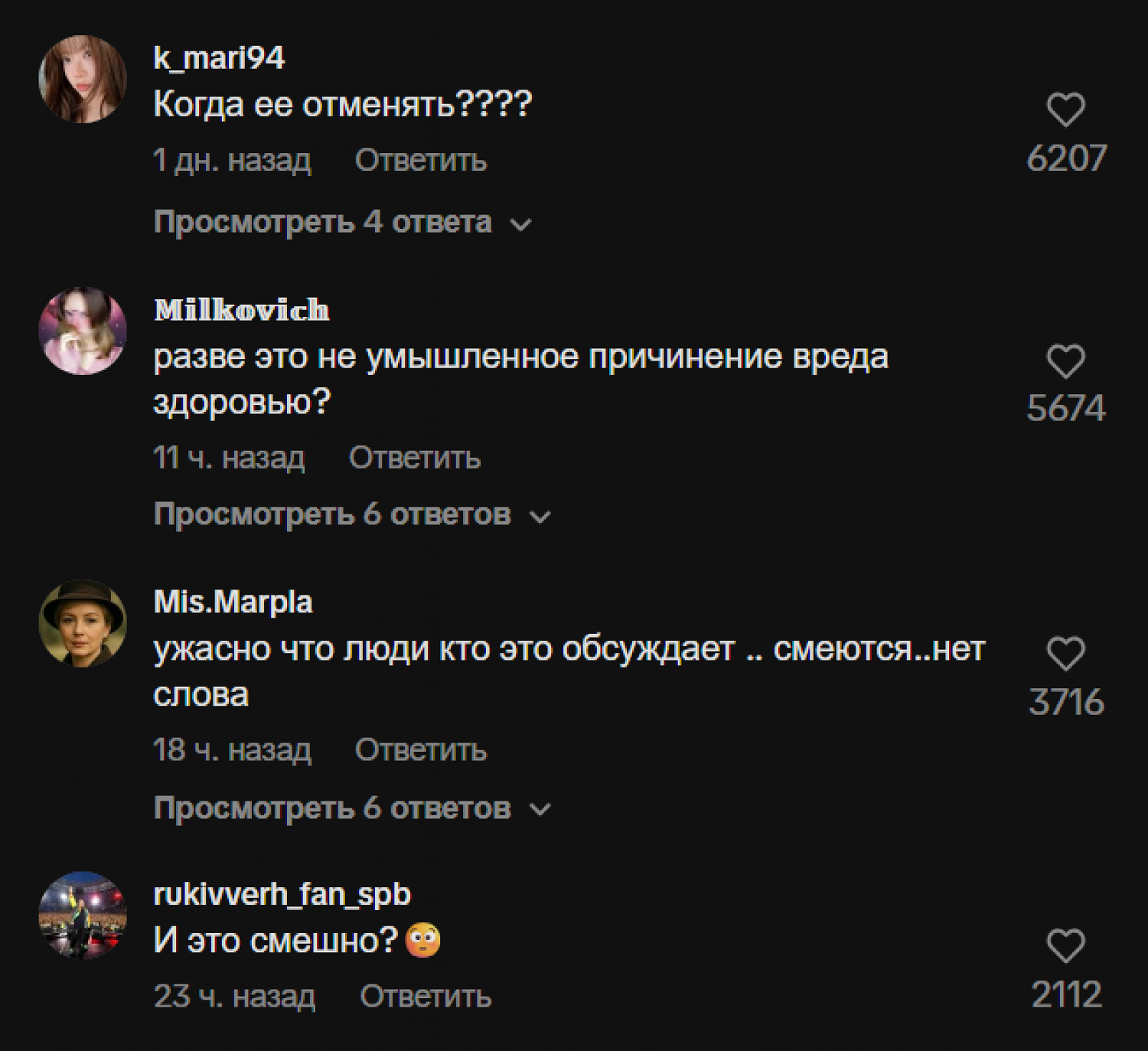 Ролик разошелся по соцсетям и оброс гневными комментариями. Пользователи в шоке не только от поступка Тодоренко, но и от того, что об этой ситуации она рассказала с иронией. Некоторые вспомнили, как телеведущую уже отменяли ― из-за ее слов о домашнем насилии. В 2020-м она назвала психически больными женщин, которые публично возмущаются, что муж их бьет. Тодоренко предложила пострадавшим от побоев супруга задаться вопросом: «А что ты сделала, чтобы он тебя не бил?».