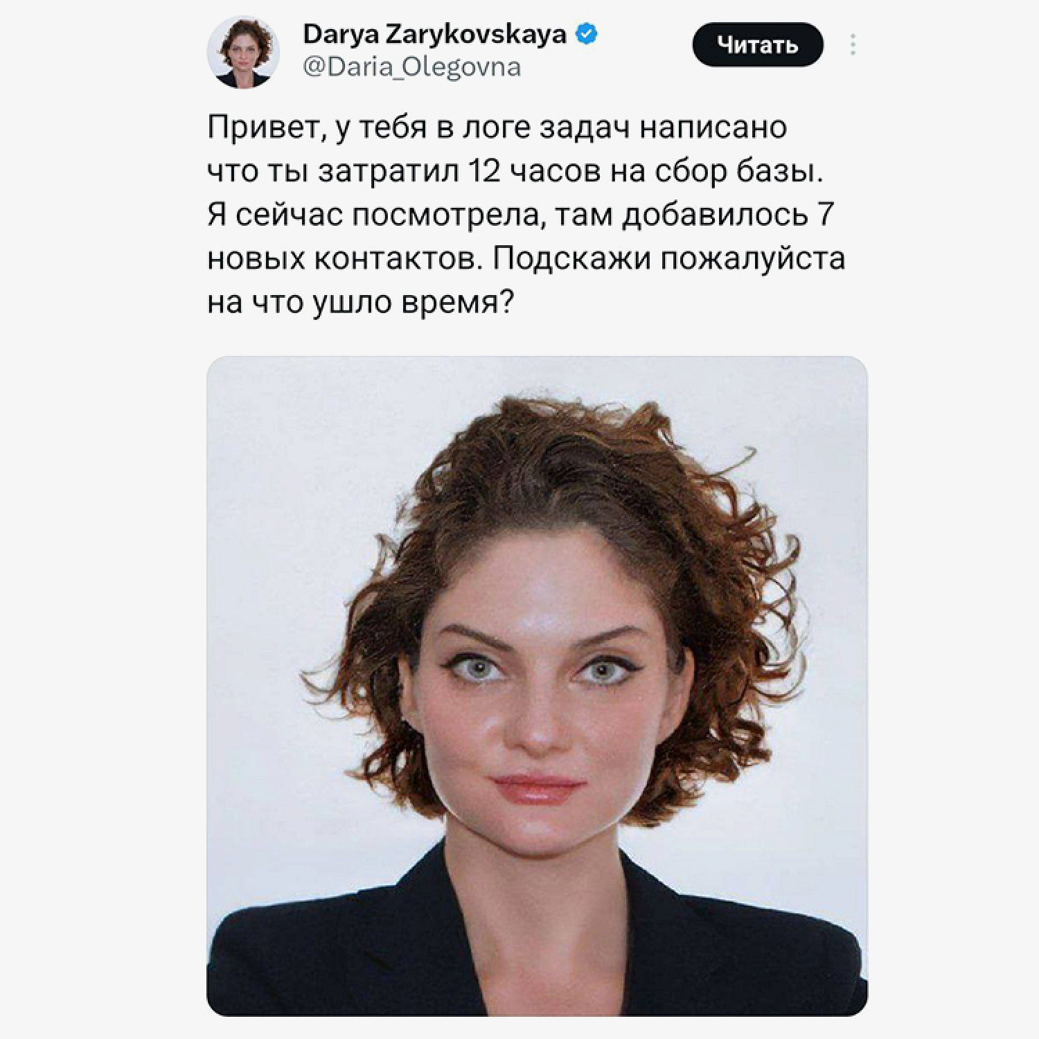 Другим пользователям внешность девушки тоже напомнила архетип злой руководительницы. Фотографию Дарьи они начали постить с вариантами реплик, которые можно услышать от босса: «Ты просто не хочешь работать», «Можешь поработать в отпуске, Египет твой никуда не убежит», «Включи камеру, давай обсудим твою дальнейшую работу у нас» и так далее.