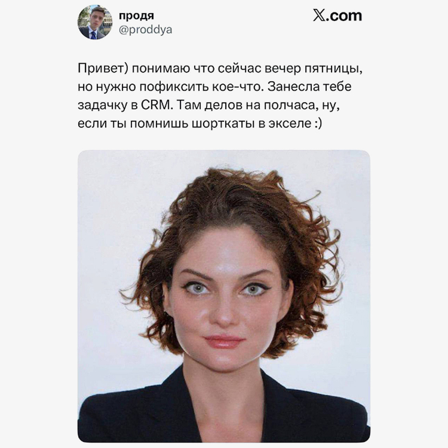 Предпринимательница Дарья Зарыковская поделилась своим фото, которое сделала для документов. Она заметила сходство между собой на этом кадре и токсичной начальницей, подписала снимок в токсично-офисном стиле и запустила тем самым тренд в твиттере.