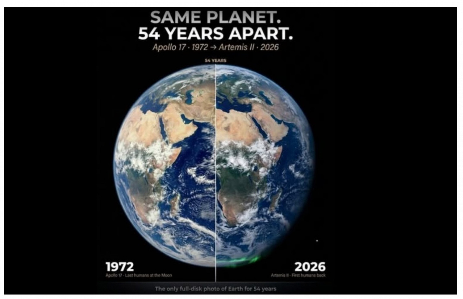 Изображение, распространяемое в сети. На нем утверждается, что снимок 1972 года идентичен фото 2026 года. Они якобы сделаны командами «Аполлон-17» и «Артемиды-2».