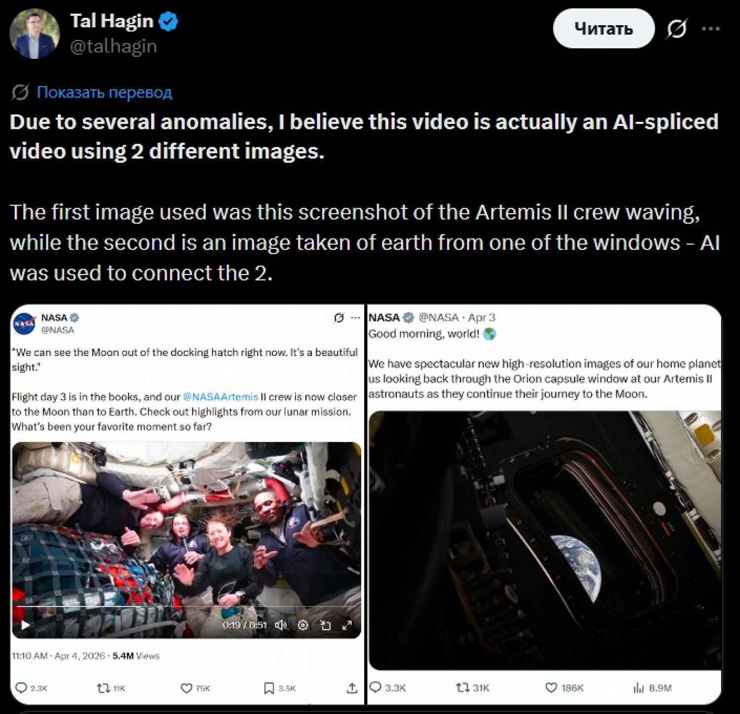 «Из‑за нескольких аномалий я считаю, что это видео в действительности ИИ-объединение, использующее два разных изображения. Первое — это скриншот машущей команды „Артемиды-2“, а второе — фото Земли, сделанное из одного из иллюминаторов. ИИ использовали, чтобы соединить их».