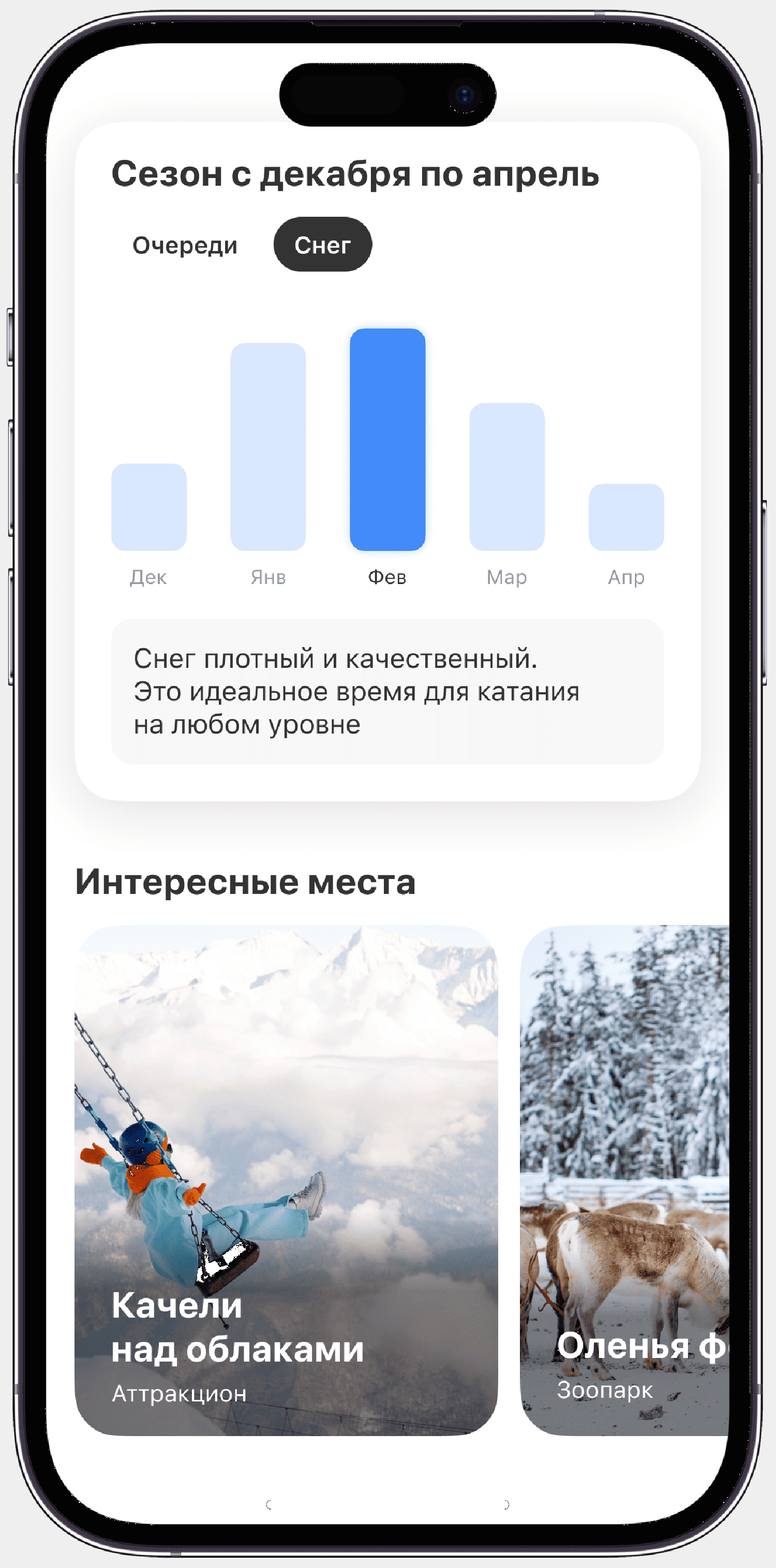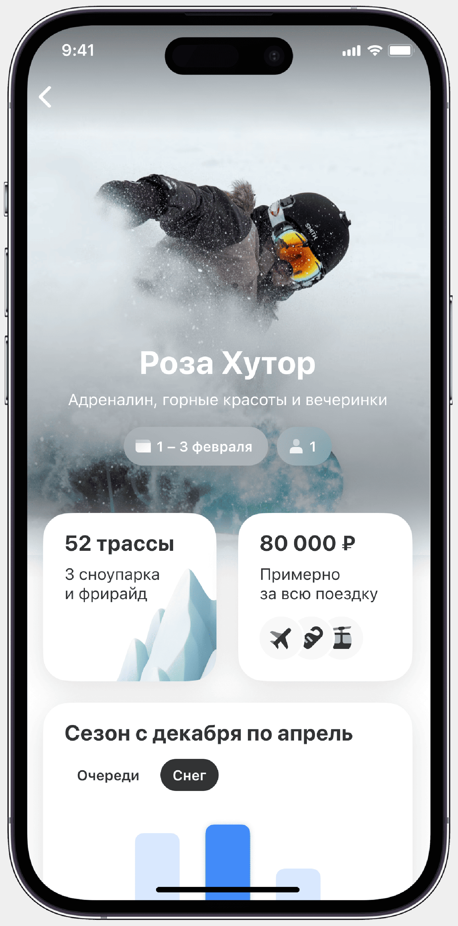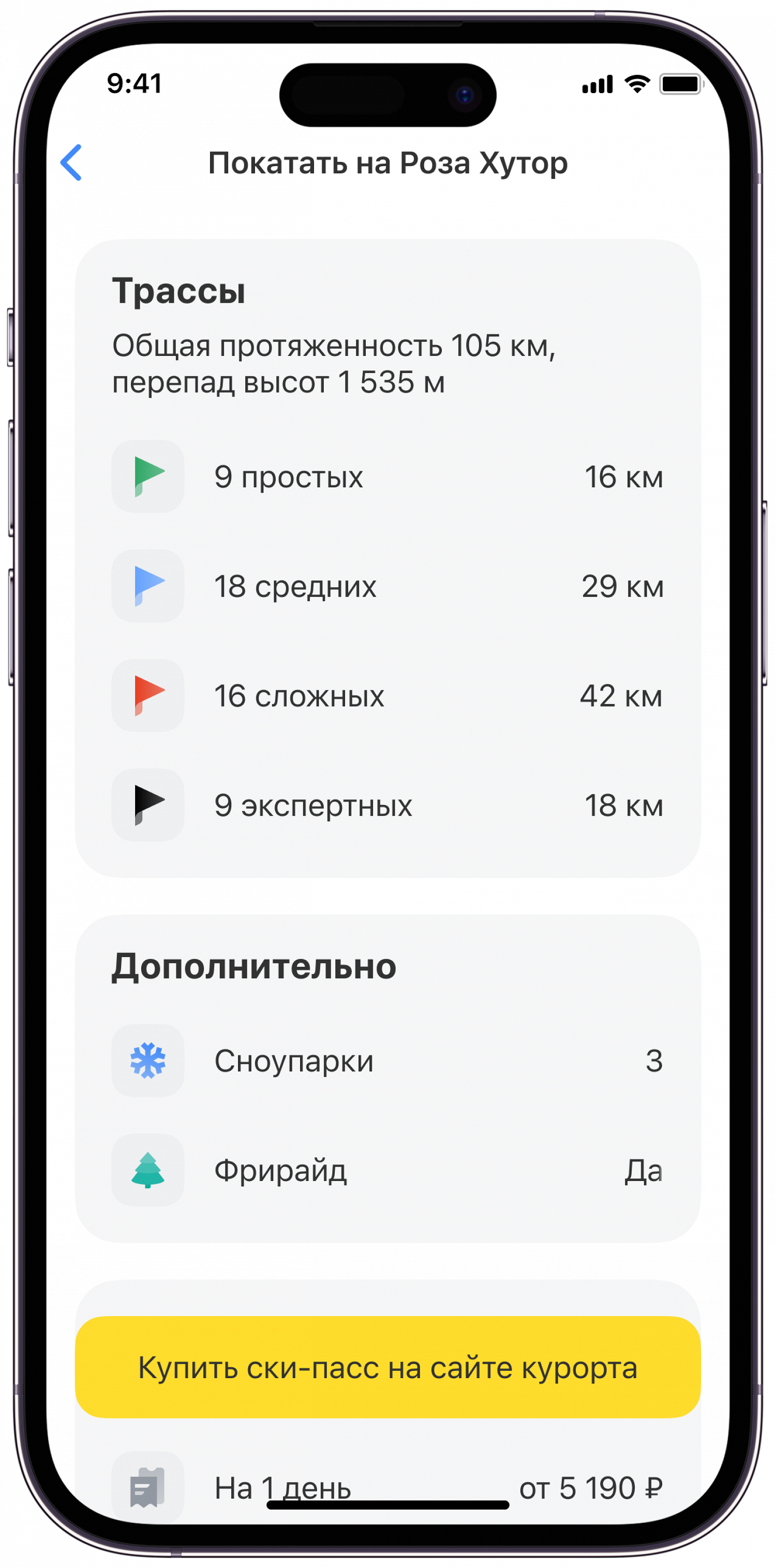 На платформе можно найти информацию о трассах курорта, ски-пассах, погодных условиях, а также загрузке склонов в разные сезоны. Доступна также функция «Калькулятор» для расчета бюджета поездки: проживания, авиабилетов, питания, проката инвентаря и услуг инструктора.
