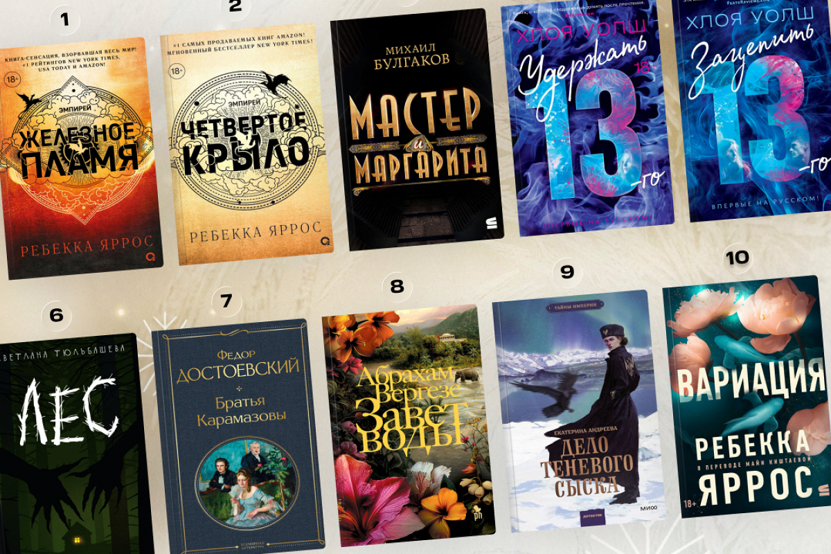 «Удержать 13-го» и «Зацепить 13-го» Хлои Уолш ― на четвертом и пятом местах. В топ-10 также вошли: «Лес» Светланы Тюльбашевой, «Братья Карамазовы» Федора Достоевского, «Завет воды» Абрахама Вергезе, «Дело теневого сыска» Екатерины Андреевой и «Вариация» Ребекки Яррос.