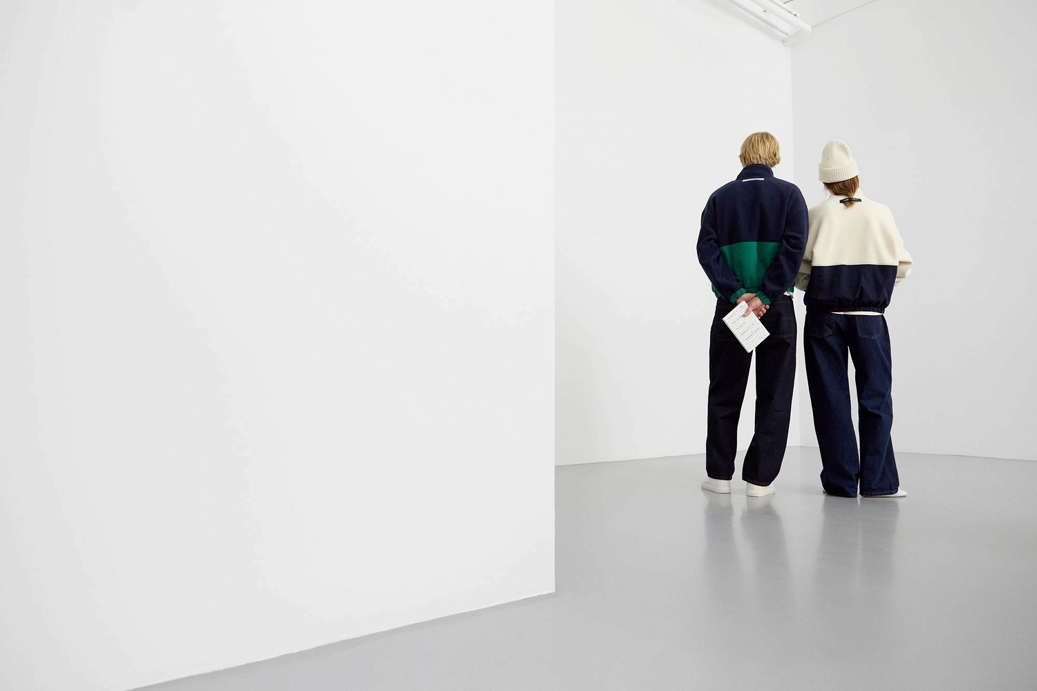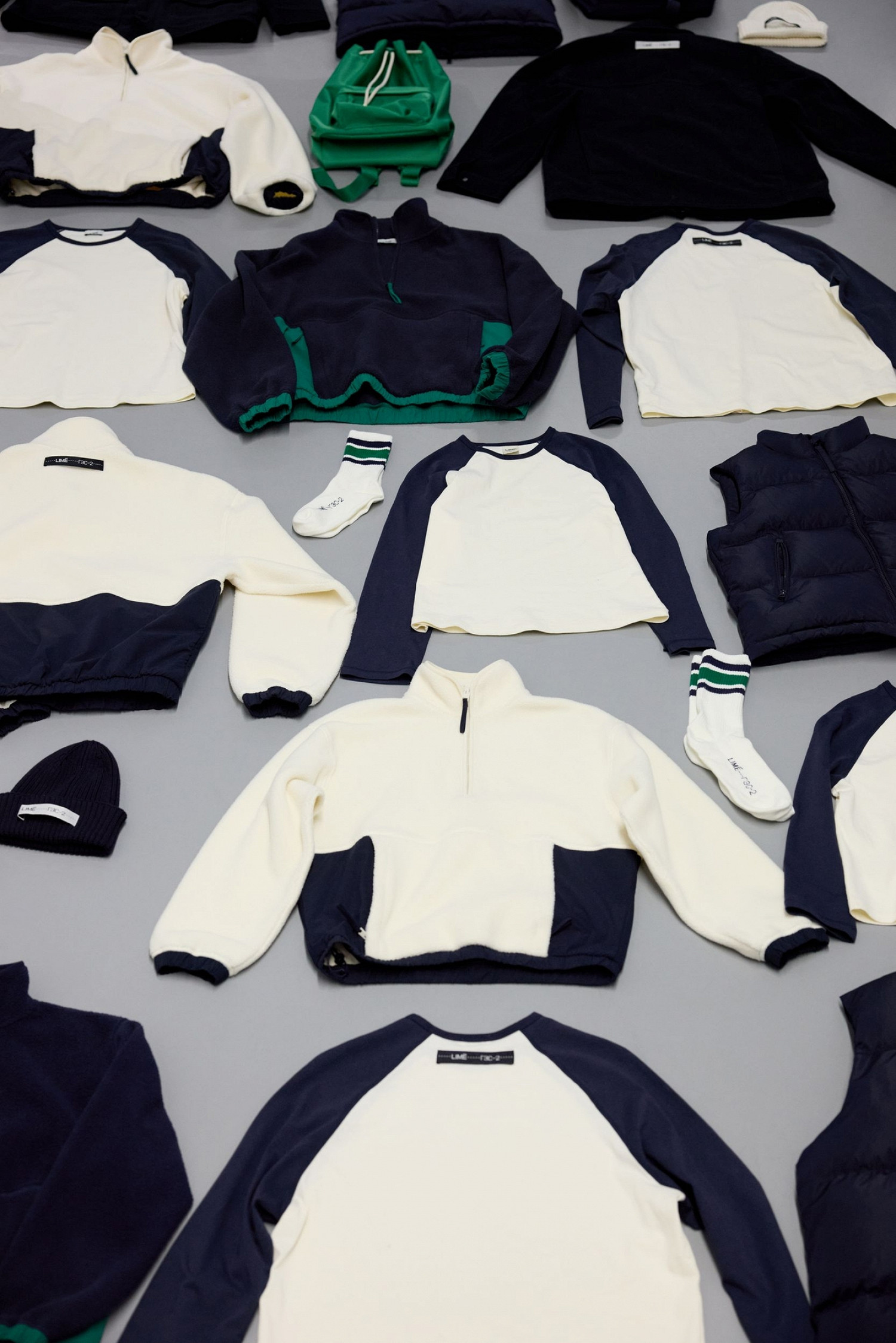 Главными оттенками дропа стали теплый белый, темный синий и глубокий зеленый. Последний отсылает к сохраненным при реконструкции Дома культуры промышленным артефактам.