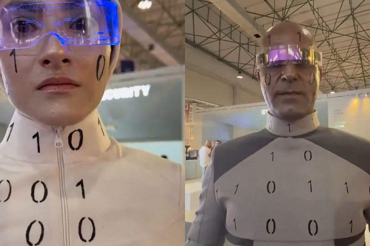 «Роботы» ― мужчина и женщина ― были одеты в костюмы, украшенные двоичным кодом из нулей и единиц. Посетителей пара уверяла, что перед ними не люди, а продвинутые машины. Однако человеческую натуру гуманоидов выдали дыхание, следы от акне на коже, моргание и неестественные «роботизированные движения».