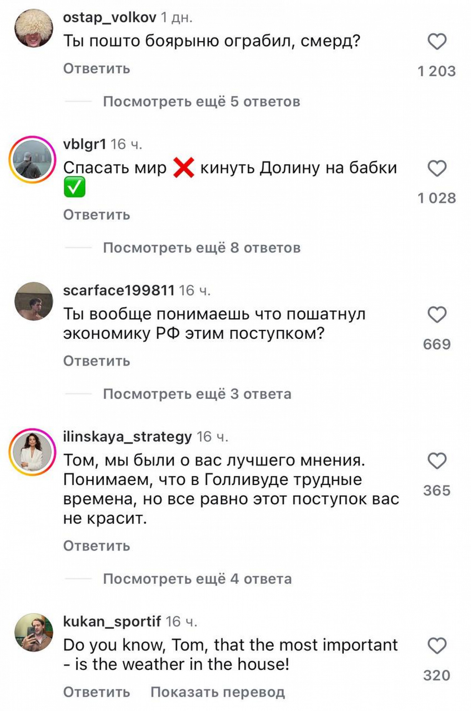 Они спрашивают у Тома, зачем он обманул артистку, и просят его вернуть деньги. «Понимаем, что в Голливуде трудные времена, но все равно этот поступок вас не красит», — шутят в одном из комментариев. Сам актер пока никак не прокомментировал ситуацию.