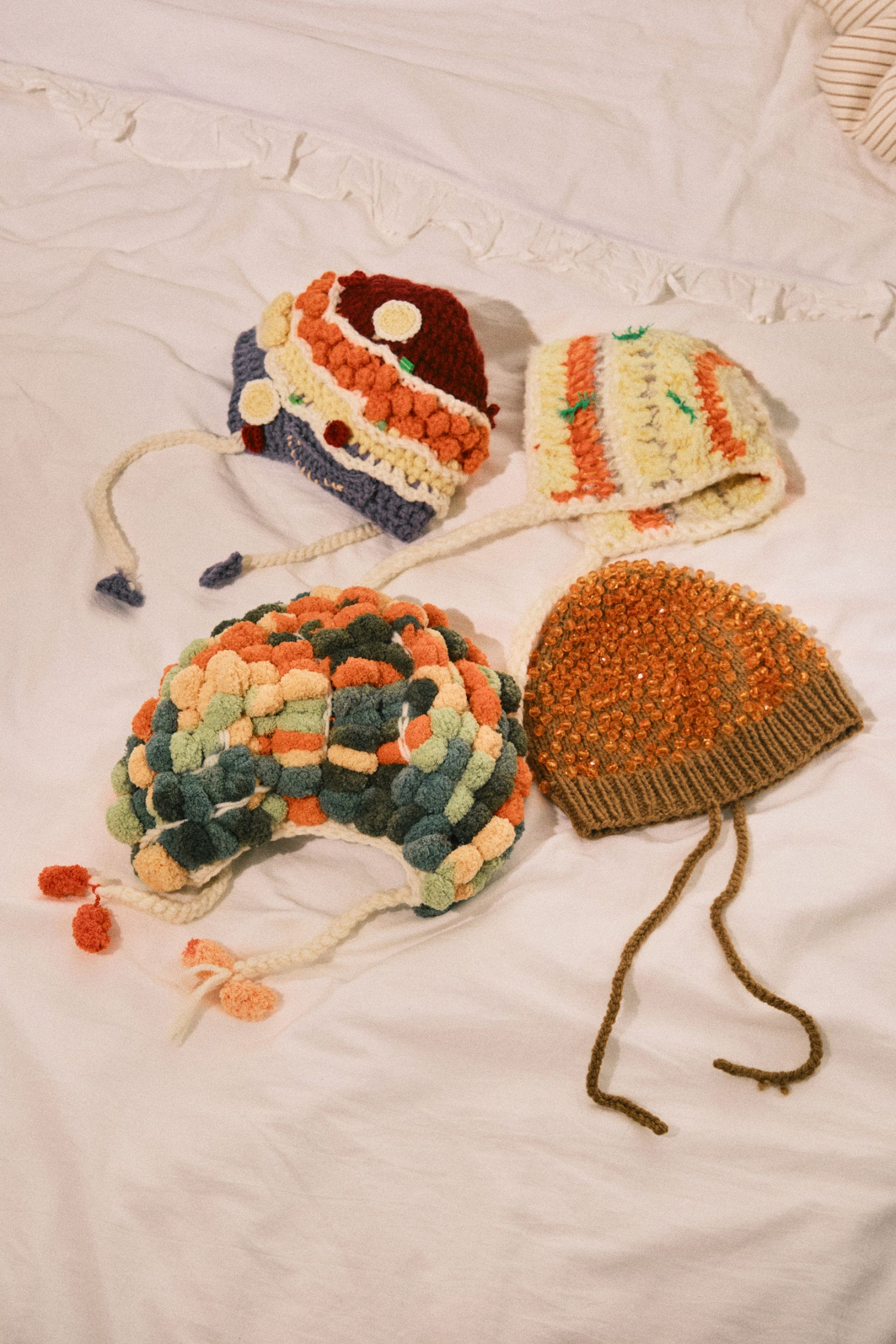 В нее вошли вязаные чепчики в виде главных блюд праздничного стола. Аксессуары выполнены в форме салата оливье, селедки под шубой, «Мимозы» и бутерброда с красной икрой.
