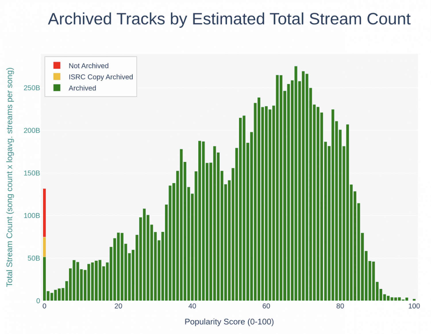 На основе собранной информации была подготовлена статистика. Более 70% песен на платформе практически не слушают — у них менее 1000 прослушиваний. Большинство прослушиваний приходится на песни с популярностью 50–80 (по 100-балльной шкале), хотя таких песен всего 210 тыс. — 0,1% от общего количества композиций на платформе.