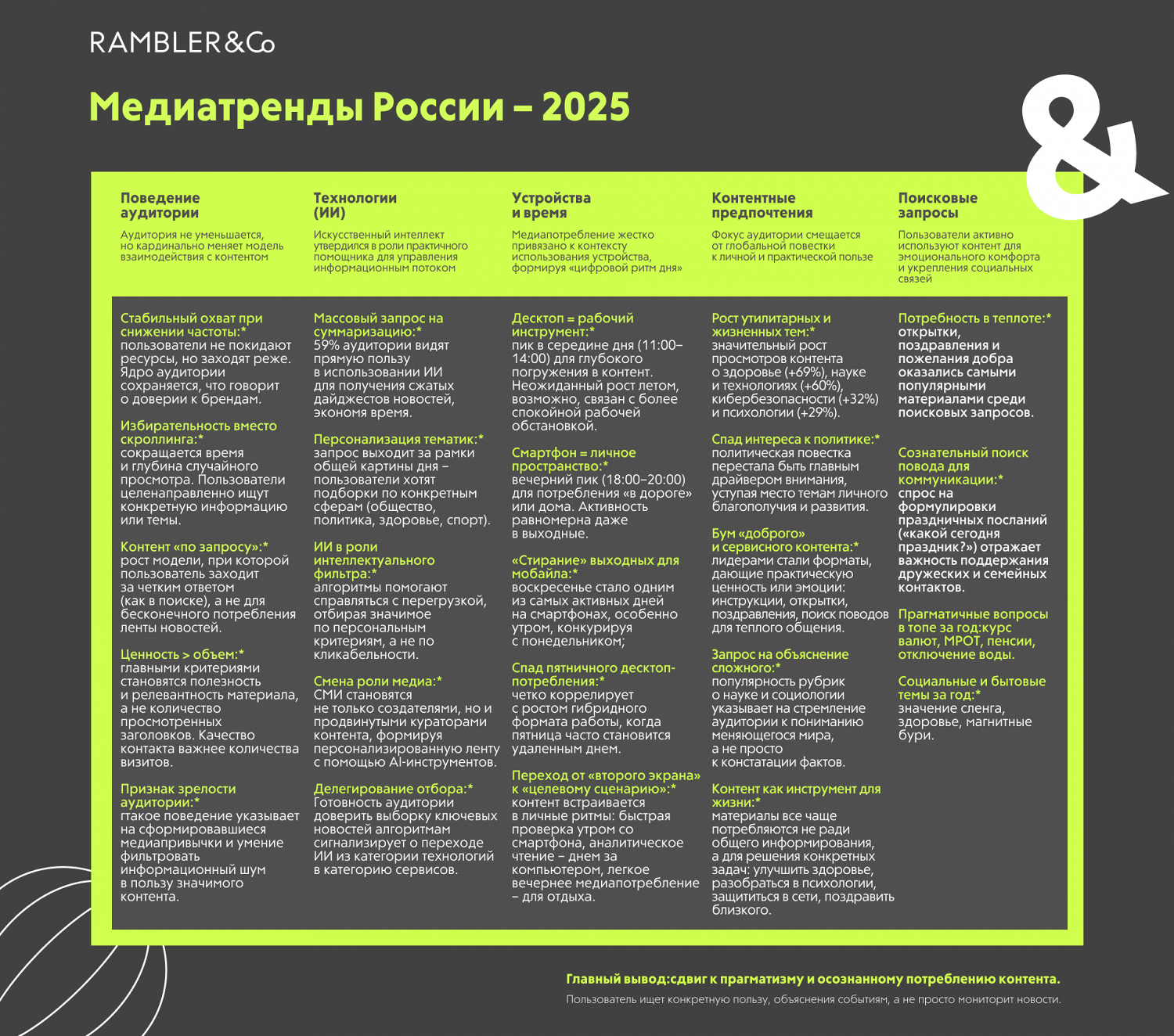 Аналитики крупнейшего медиахолдинга России Rambler&Co представили традиционный обзор трендов по итогам 2025 года. Согласно данным, пользователи все так же стремятся быть в новостной повестке, однако частота, длительность и контекст взаимодействия с контентом становятся более избирательными.