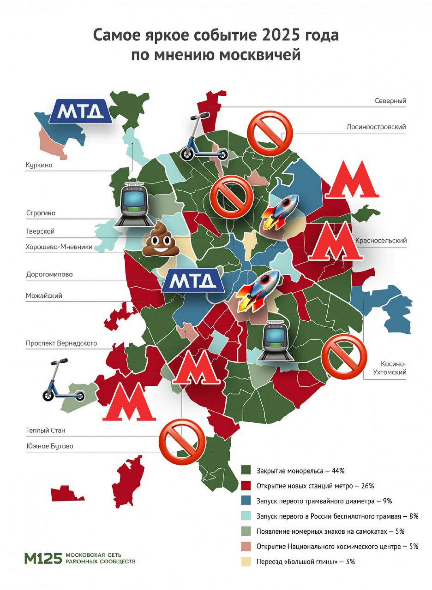 Самым ярким событием года для москвичей стало закрытие монорельса, согласно исследованию Мосопроса. Об этом сообщил телеграм-канал «Москва М125».