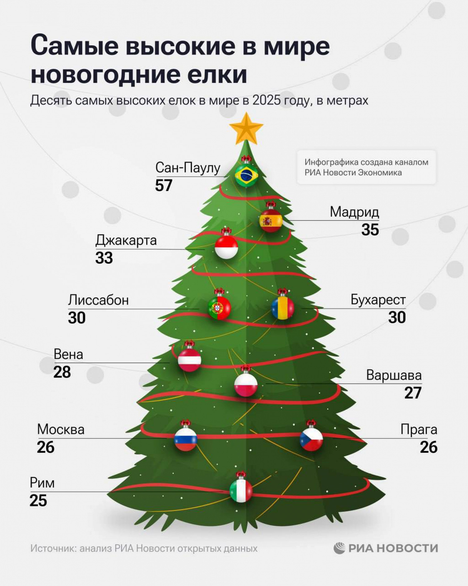 Самую высокую праздничную елку установили в Сан-Паулу в Бразилии, ее высота — 57 метров. Второй по высоте стало дерево в Мадриде в Испании — 35 метров. За ними следуют Джакарта (33 метра), Бухарест и Лиссабон (по 30 метров), Вена (28 метров), Варшава (27 метров).