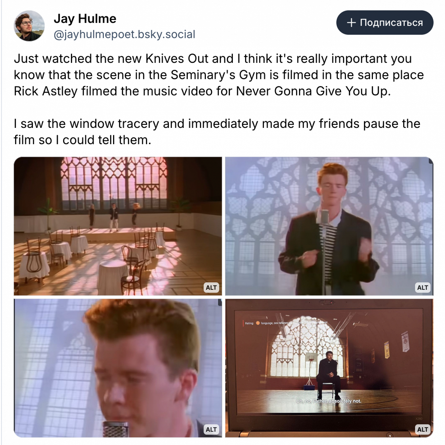 На это обратил внимание пользователь социальной сети Bluesky, заметив на заднем плане в фильме уникальное окно с цветочным орнаментом, в точности повторяющее интерьер из видео Эстли. «Увидел оконный узор и сразу заставил друзей поставить фильм на паузу», — написал он.