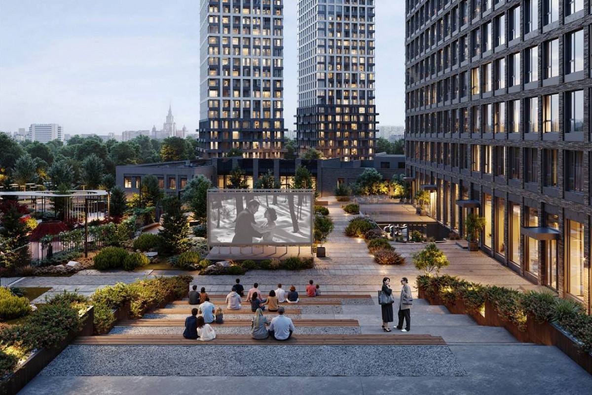 Многоуровневые зоны отдыха, стилизованные под горный склон, разместятся на стилобате между корпусами первой очереди ЖК. Они образуют два амфитеатра с акцентной подсветкой и озеленением, интегрированным прямо в деревянные ступени.