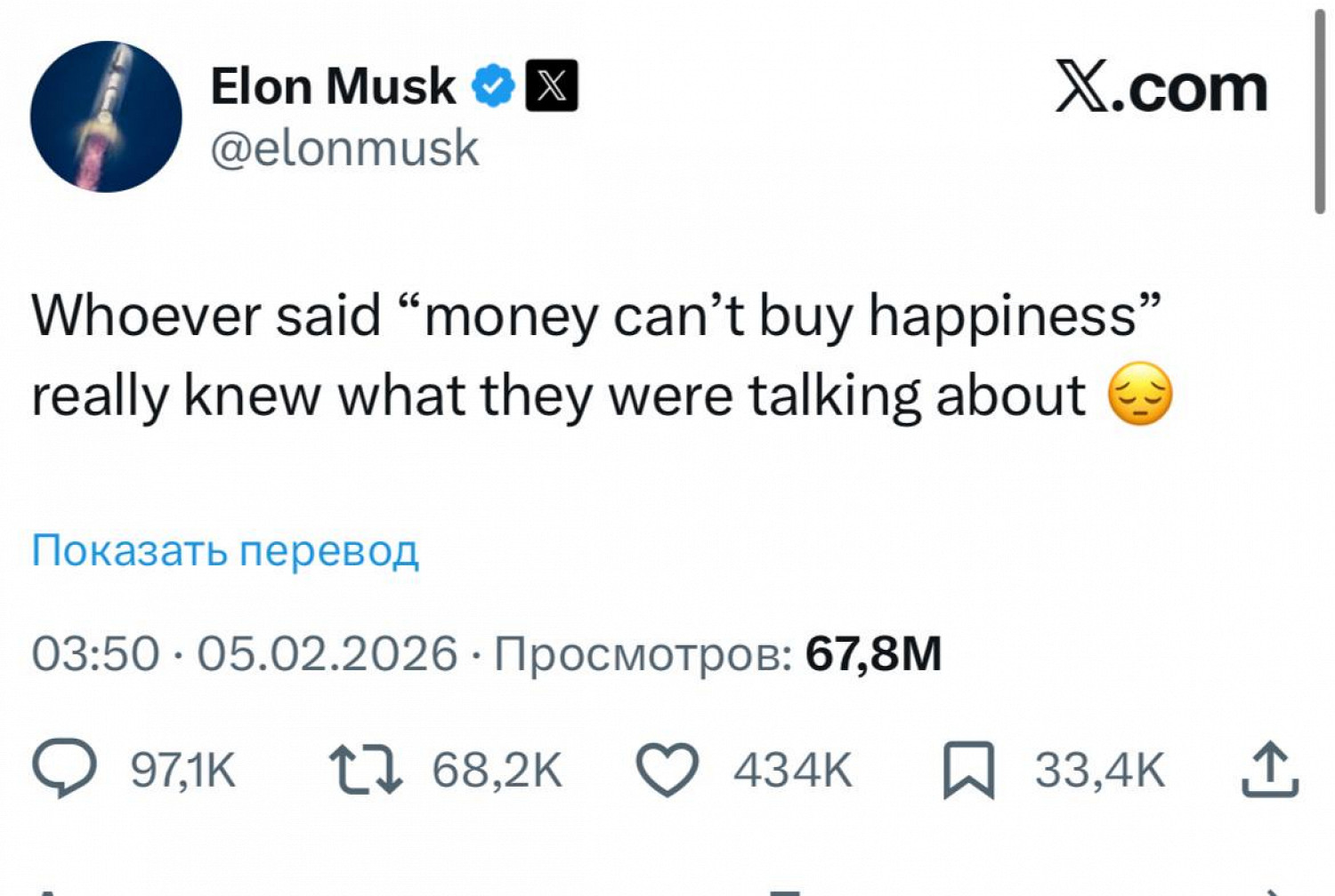 «Тот, кто сказал „счастье за деньги не купишь“, точно знал, о чем говорил», — отметил Маск. К посту он добавил грустный смайлик. Почему предприниматель решил написать это, неизвестно.