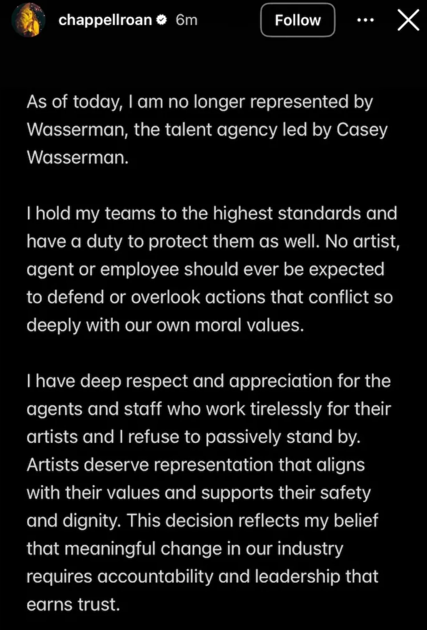 Поп-певица Чаппелл Роан объявила о разрыве отношений с музыкальным агентством Кейси Вассермана. Причиной стала публикация переписки, в которой Вассерман общался с финансистом Джеффри Эпштейном и его бывшей помощницей Гислен Максвелл.