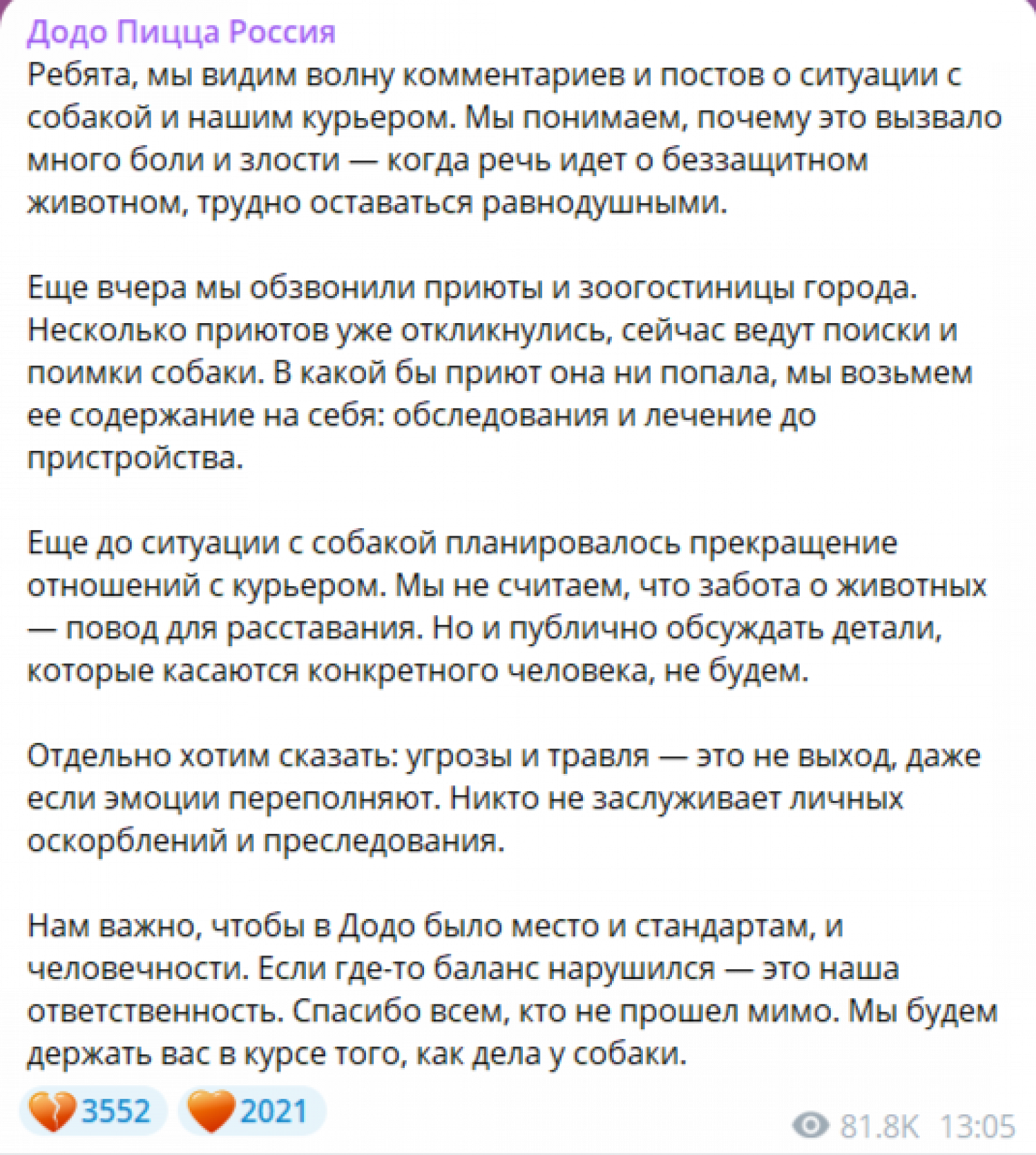 «Еще до ситуации с собакой планировалось прекращение отношений с курьером. Мы не считаем, что забота о животных — повод для расставания. Но и публично обсуждать детали, которые касаются конкретного человека, не будем», — отметили в «Додо Пицце».