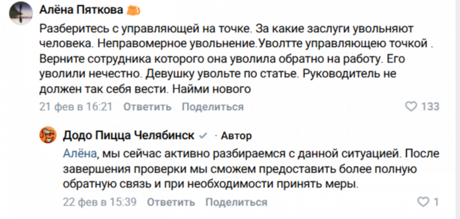 В «Додо Пицце» заявили, что сейчас «активно разбираются с данной ситуацией». «После завершения проверки мы сможем предоставить более полную обратную связь и при необходимости принять меры», —  говорится в комментарии от имени компании в группе «ВКонтакте».