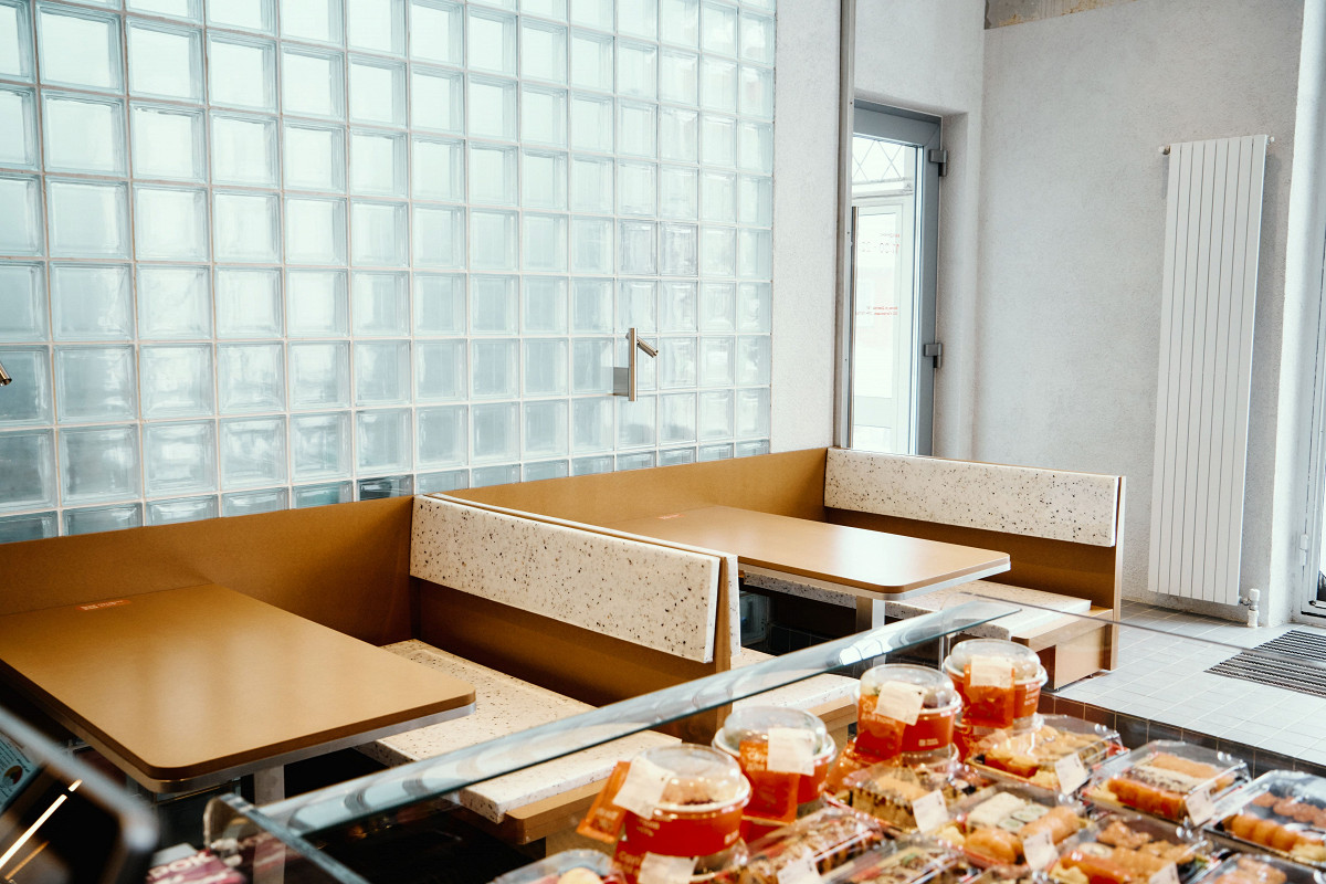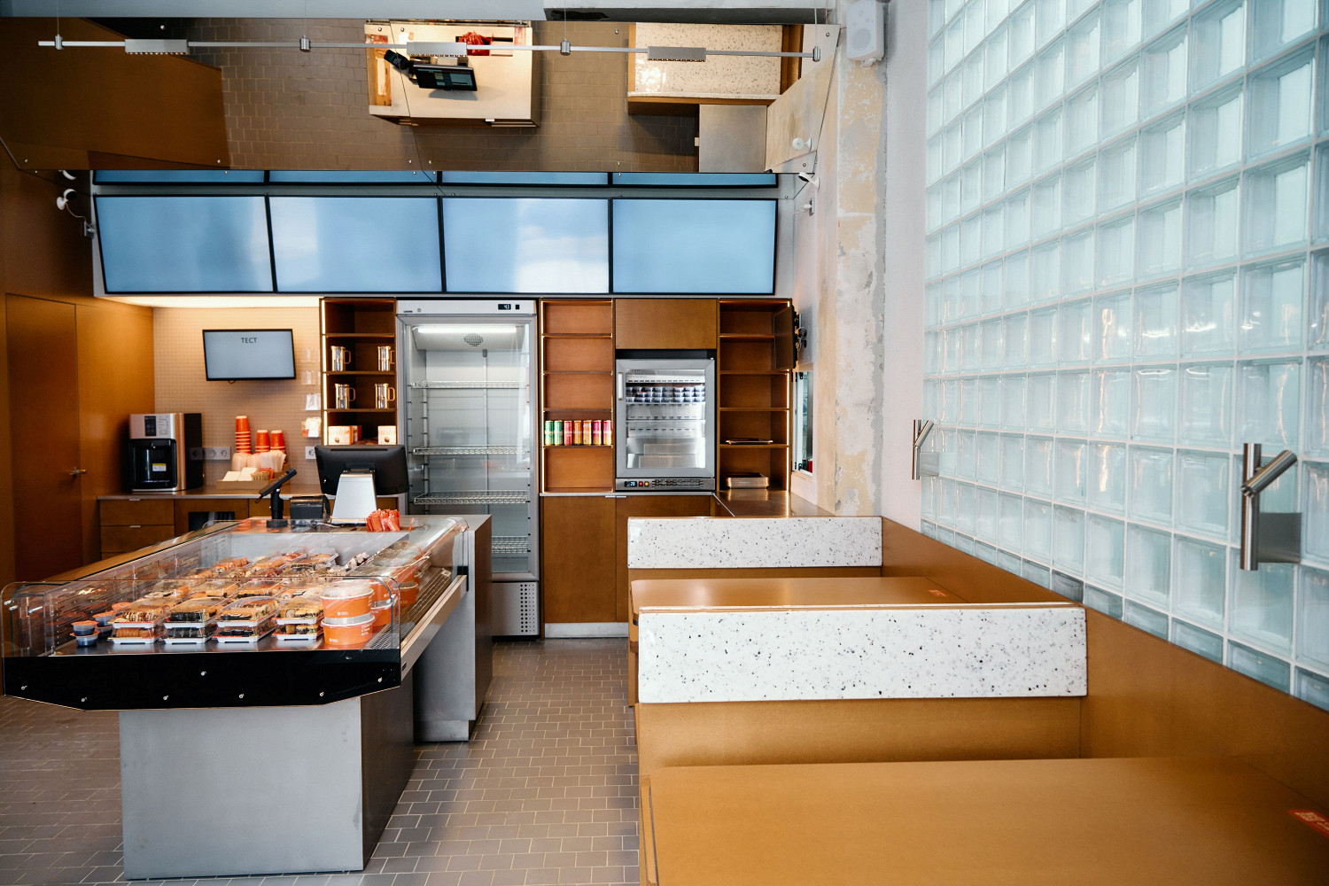 В пространстве площадью 100 квадратных метров — 16 посадочных мест, открытая кухня и витрина с готовой едой. Гости могут заказать блюда из-под ножа, а в теплое время года заработает летняя веранда. Для оформления заказов внутри установят планшеты на стойках.