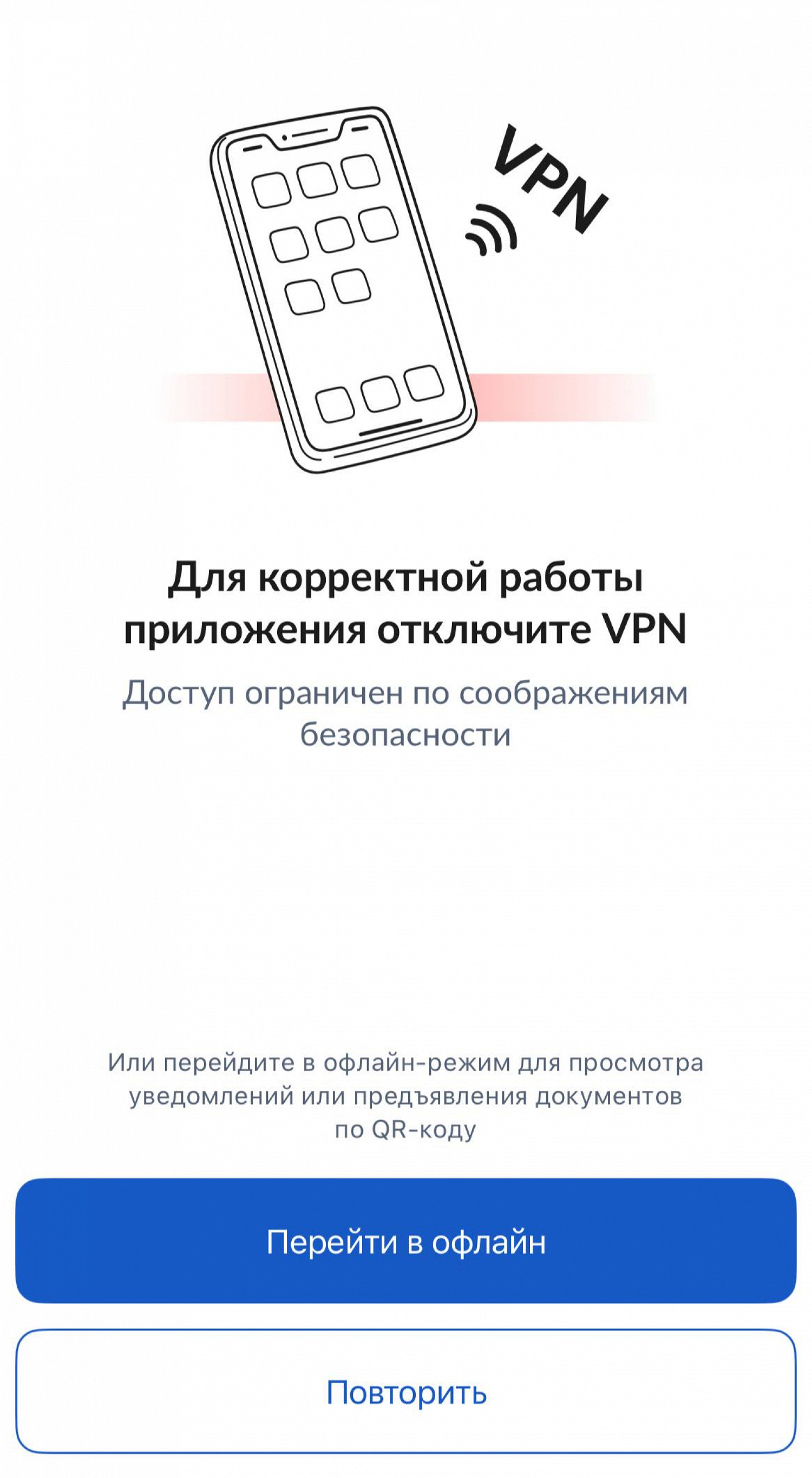«Для корректной работы приложения отключите VPN. Доступ ограничен по соображениям безопасности», — говорится в уведомлении для пользователей в таком случае. Им предлагают также перейти в офлайн-режим, с помощью которого остается возможность предъявлять документы или смотреть уведомления.