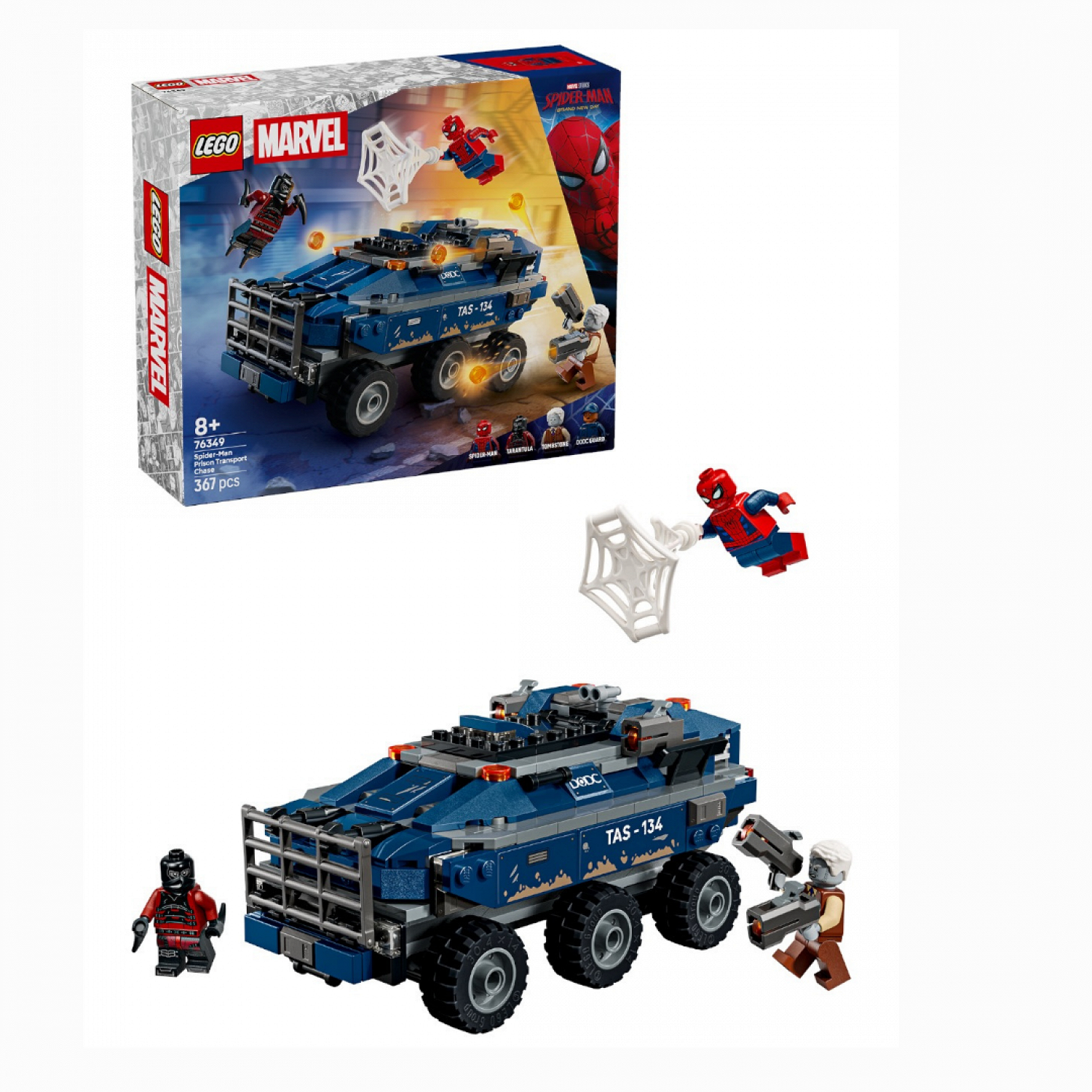 Набор «Погоня за тюремным транспортом Человека-паука» стоит 49,99 доллара и включает мини-фигурки Питера Паркера, Тарантула, Могильщика и охранника департамента по контролю за разрушениями. Можно построить большую тюремную машину с шестью колесами. В комплекте — паутина, выпускаемая из ладоней мини-фигурки, и пистолеты.