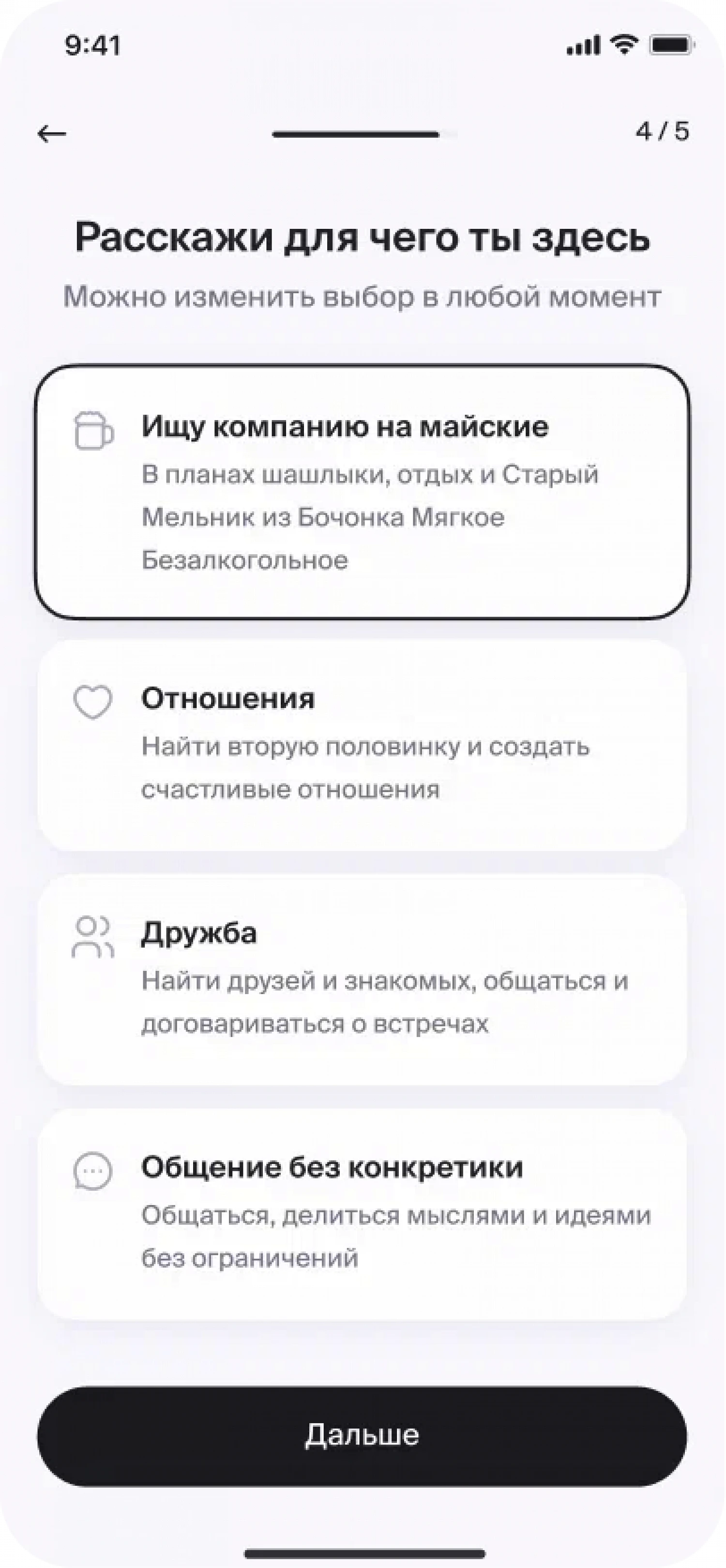 Его можно использовать не для классического дейтинга, а как инструмент для поиска компании на праздники. Пользователь может указать, как он хочет провести майские, и познакомиться с людьми, у которых похожие планы..
