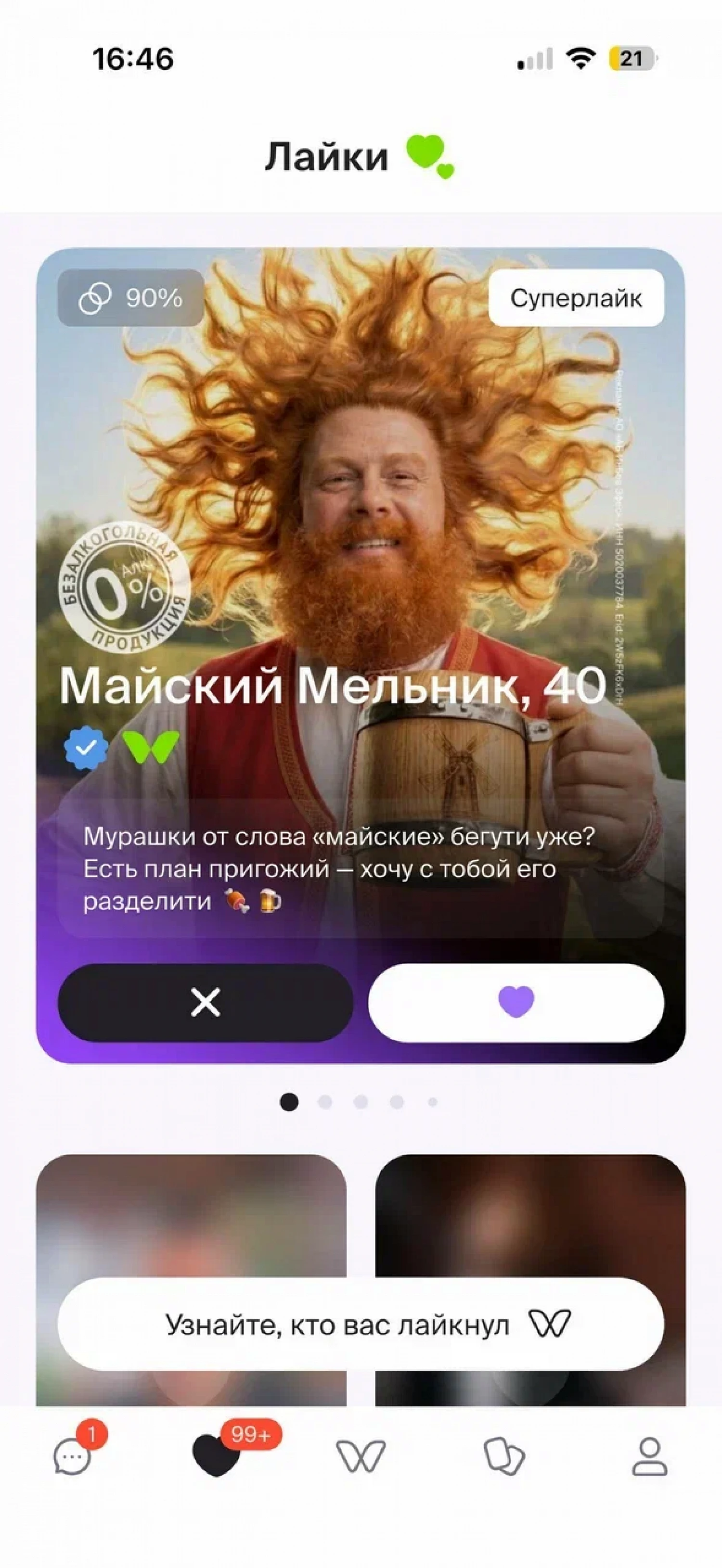 Внутри приложения также появляется специальный профиль «Майский Мельник» — добродушный персонаж и проводник в сценарии отдыха. Его анкета размещена в сервисе наравне с другими пользователями. При взаимодействии с профилем пользователю предлагается определить, как он хочет провести праздники, и перейти к подбору подходящей компании.
