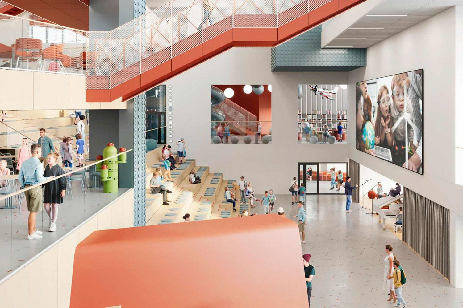 У здания будет пять этажей. Общая площадь — около 20 тыс. квадратных метров. В нем будут учебные классы, медиатеки, коворкинги, спортзалы и атриум. Школа вместит 1100 учеников с 1-го по 11-й класс.