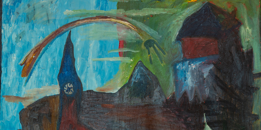 Работа Сергея Енькова «Без названия» из серии «Хозяин лампы» иллюстрирует пробы с образом и цветом в сочетании с коллажными практиками художника. Другим примером принципа коллажности на выставке является работа Франца Родвальта «По Тинторетто».
