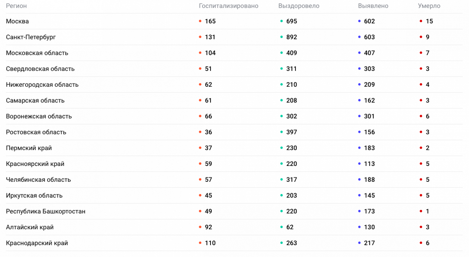 Больше всего заражений зафиксировано в Петербурге — 603. За ним следуют Москва, Московская, Свердловская, Воронежская и Волгоградская области.