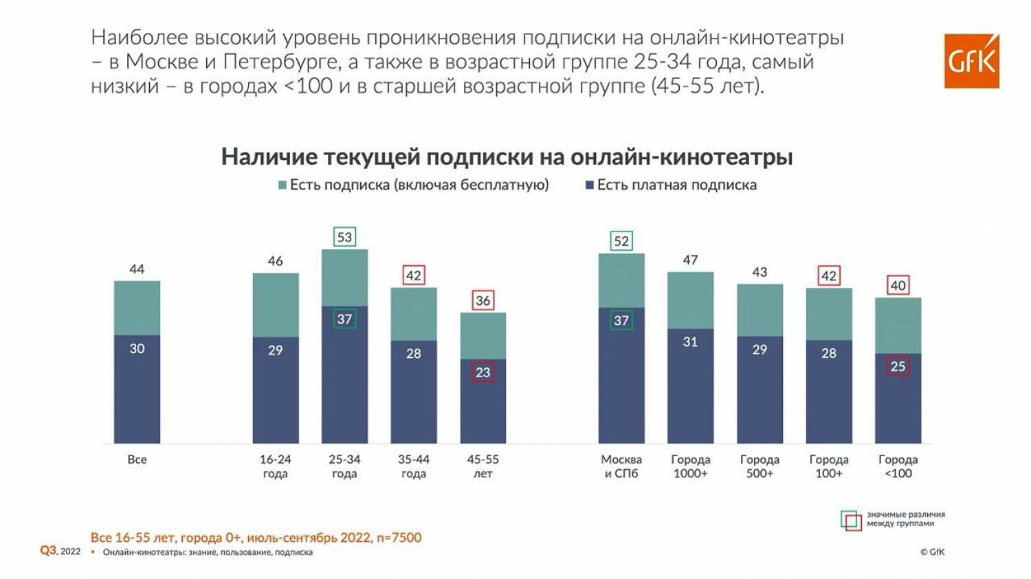 В третьем квартале 2022 года доля подписчиков онлайн-кинотеатров в России выросла на 2% (до 44%) после снижения во втором квартале. Об этом свидетельствуют данные, которыми аналитическая компания Gfk поделилась с «Афишей Daily».