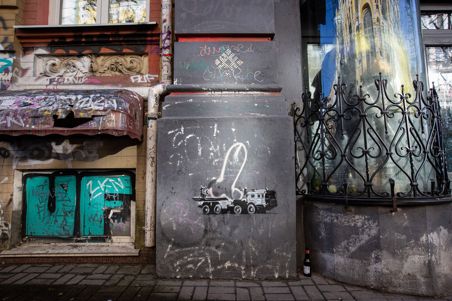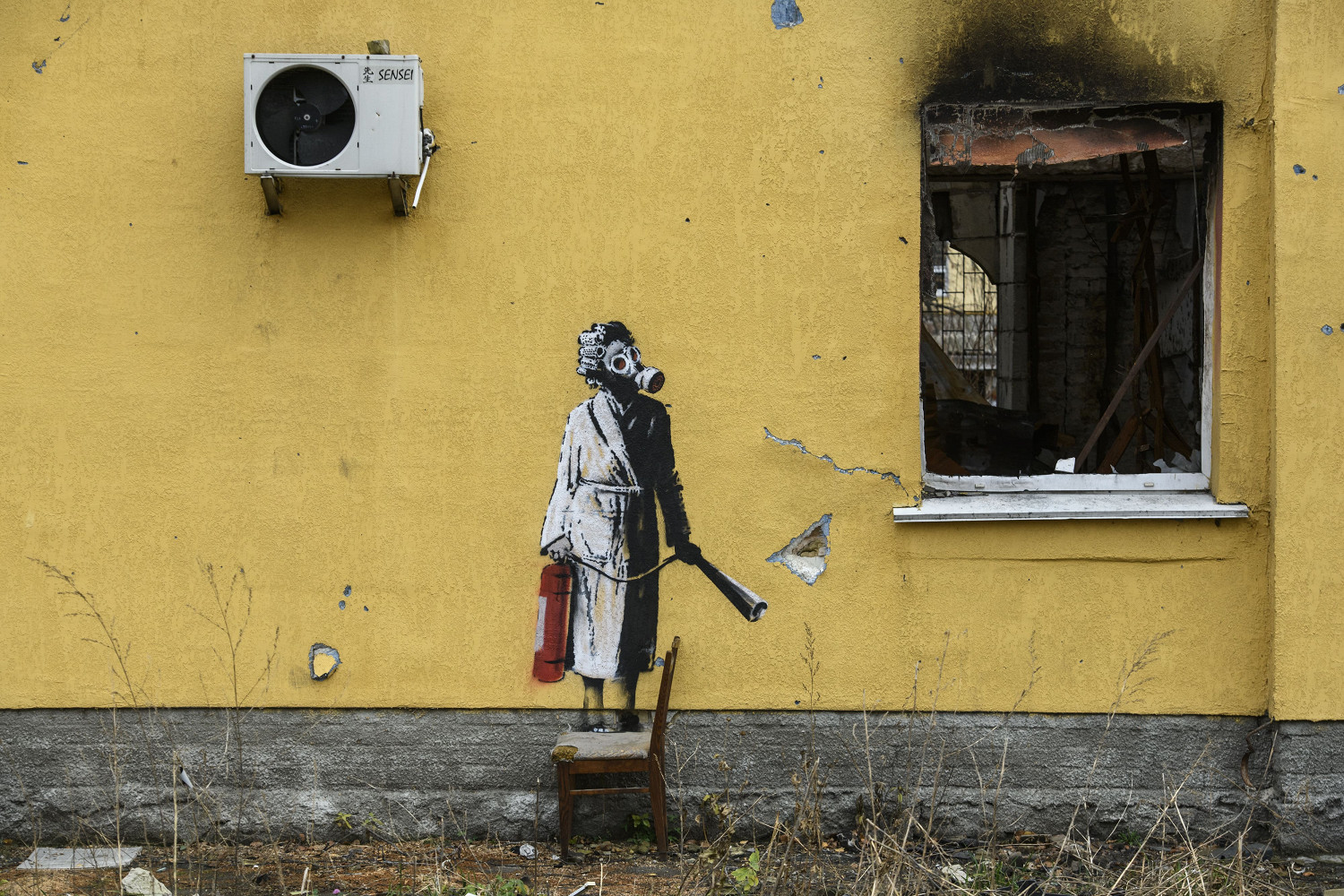 Кроме того, Бэнкси создал образ женщины в халате и противогазе, держащей огнетушитель в руках, и нарисовал бородатого мужчину, принимающего ванну. Также авторству Бэнкси принадлежат еще две работы, об одной из которых «Афиша Daily» рассказывала ранее.