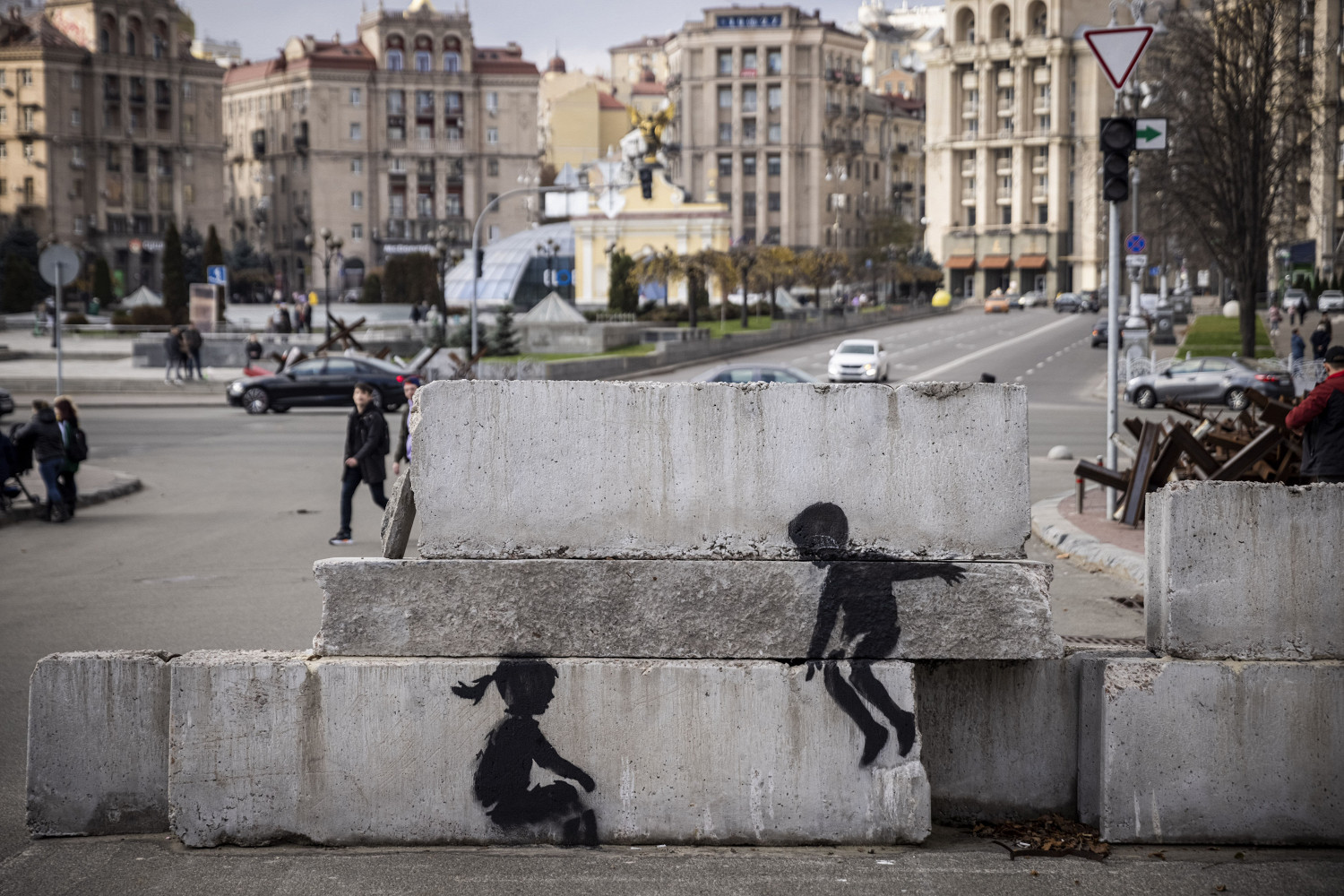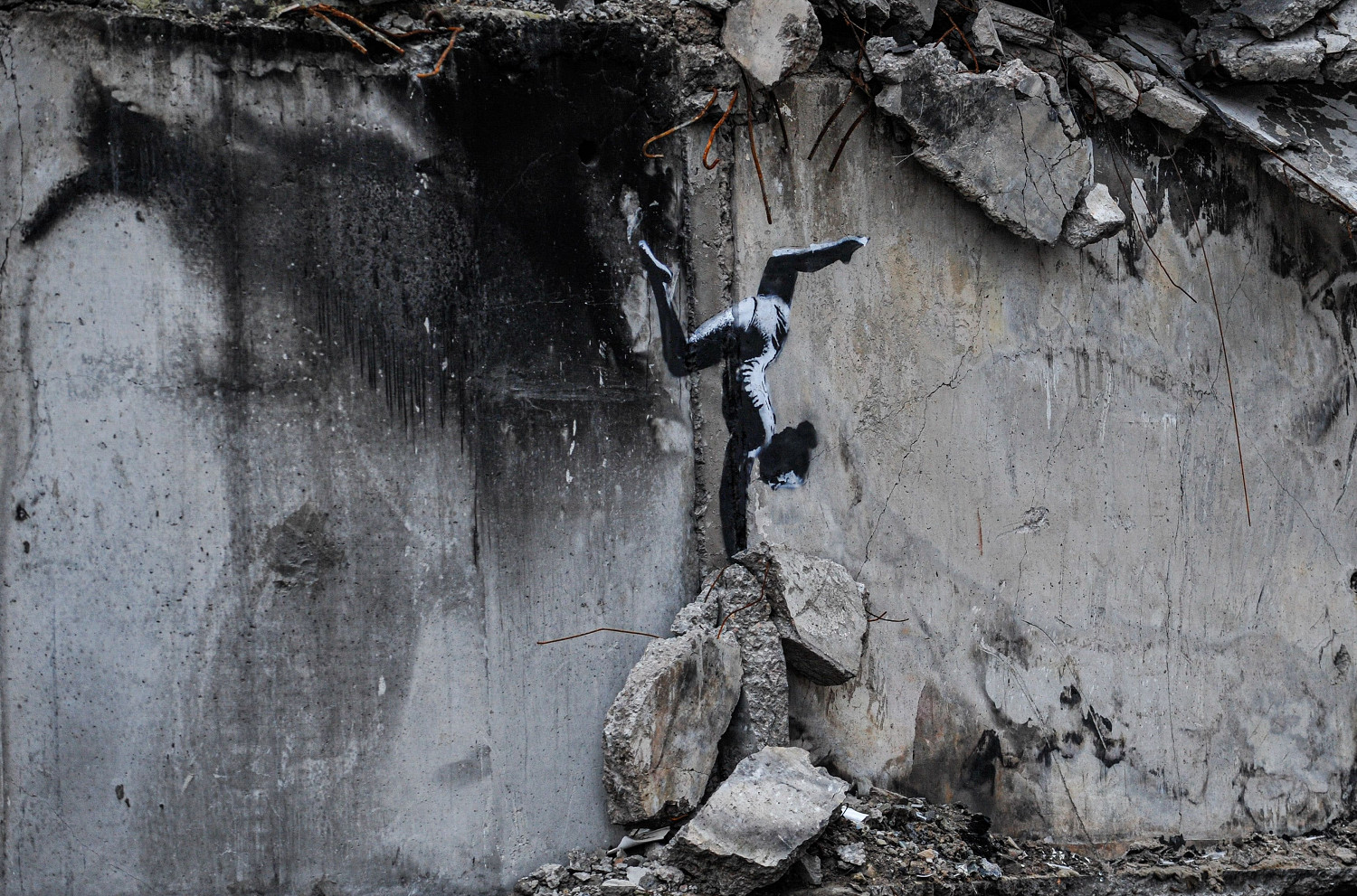 Работы Бэнкси обнаружили в том числе в Киеве, Ирпене и Бородянке. На одних из них изображен мужчина, брошенный маленьким мальчиком на пол во время матча по дзюдо. На других граффити — двое детей, использующие противотанковый еж в качестве качелей.