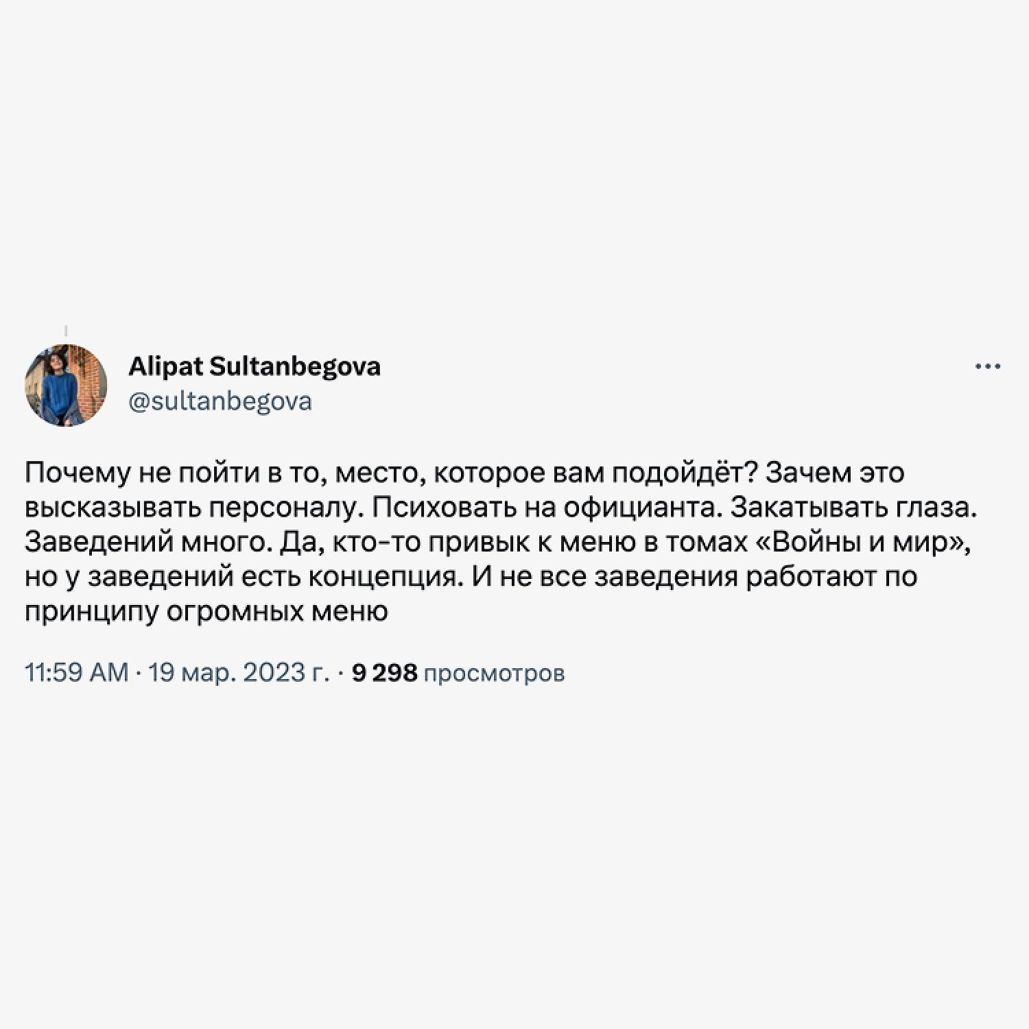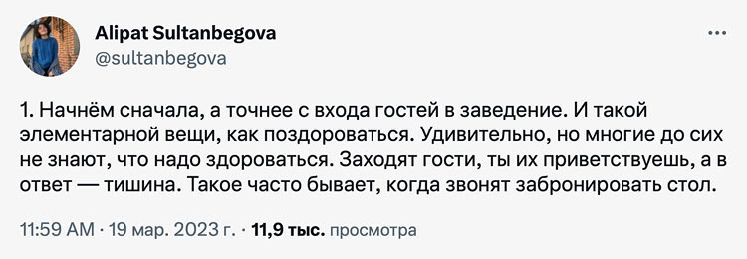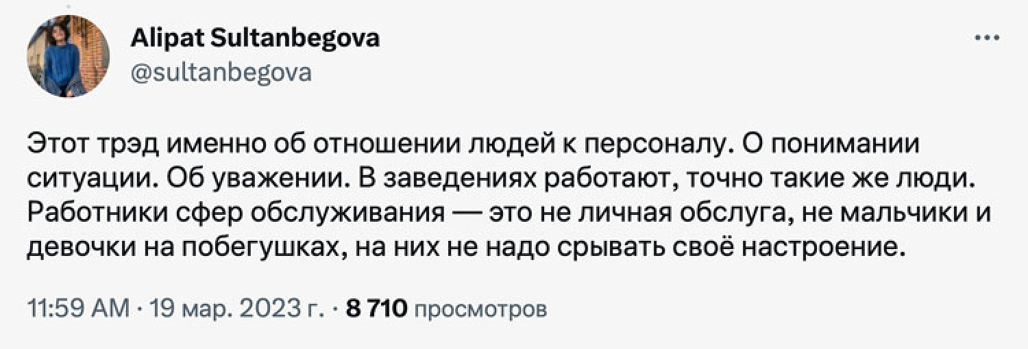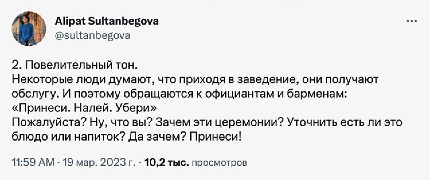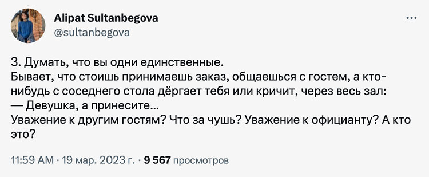 Официантка решила подробно не останавливаться на теме чаевых, так как эта тема до сих пор вызывает множество споров, и ей не хочется что‑то доказывать об этом дополнении к заработку. «Для себя я давно решила: свои деньги я заработаю», — пишет она. Первое, на что обращает внимание пользовательница, — многие гости заведения не здороваются и не отвечают на приветствие персонала. Часто она встречает повелительный тон: «Принеси, налей, убери». Еще одно наблюдение девушки: иногда гости просят сразу принять заказ, при этом начинают говорить по телефону и задерживают официанта, у которого есть другая работа в зале. Зачастую именно официантам высказывают претензии «о скудности меню», не принимая во внимание концепцию заведения, у которого есть только определенный набор блюд. И это лишь часть неприятных моментов, о которых пишет пользовательница. «Работники сфер обслуживания — это не личная обслуга, не мальчики и девочки на побегушках, на них не надо срывать свое настроение», — подводит итог @sultanbegova.