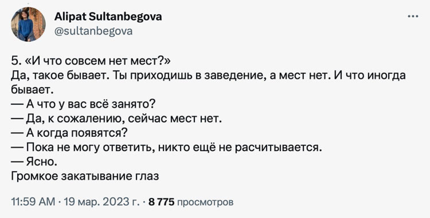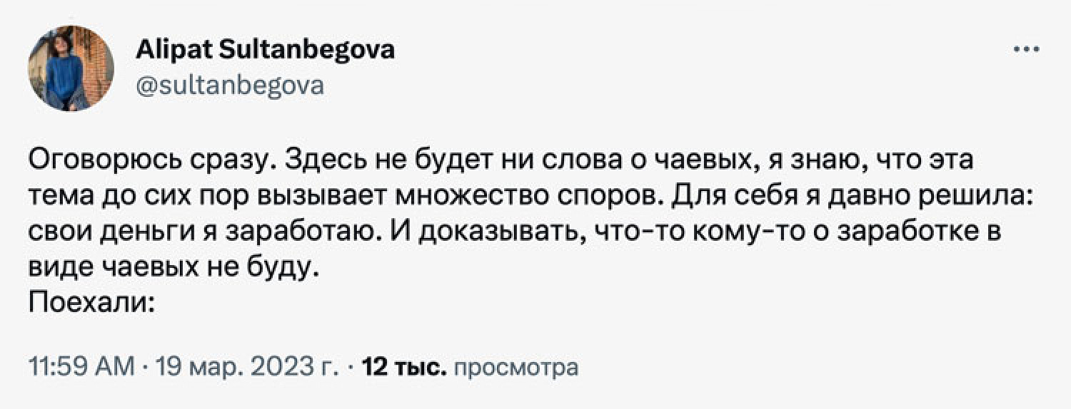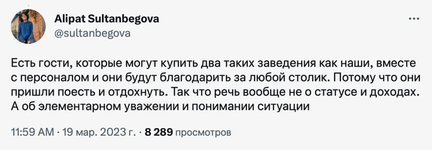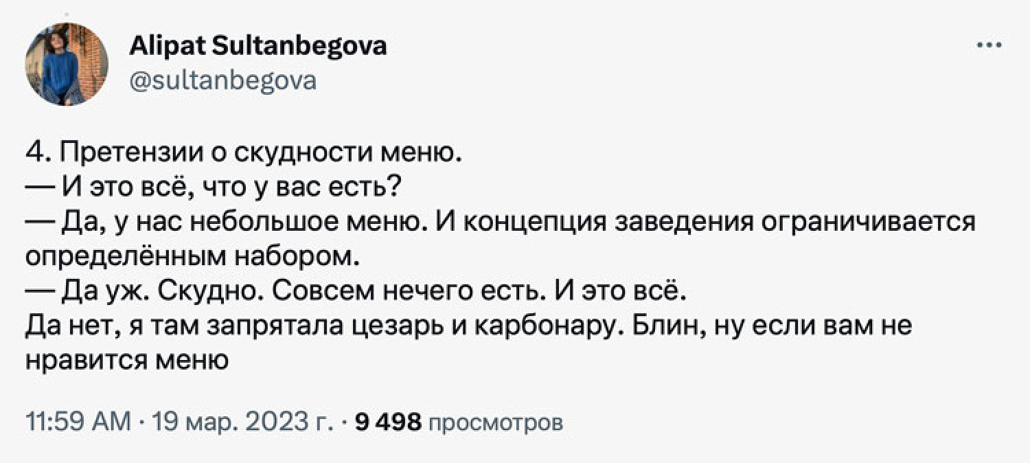 Официантка решила подробно не останавливаться на теме чаевых, так как эта тема до сих пор вызывает множество споров, и ей не хочется что‑то доказывать об этом дополнении к заработку. «Для себя я давно решила: свои деньги я заработаю», — пишет она. Первое, на что обращает внимание пользовательница, — многие гости заведения не здороваются и не отвечают на приветствие персонала. Часто она встречает повелительный тон: «Принеси, налей, убери». Еще одно наблюдение девушки: иногда гости просят сразу принять заказ, при этом начинают говорить по телефону и задерживают официанта, у которого есть другая работа в зале. Зачастую именно официантам высказывают претензии «о скудности меню», не принимая во внимание концепцию заведения, у которого есть только определенный набор блюд. И это лишь часть неприятных моментов, о которых пишет пользовательница. «Работники сфер обслуживания — это не личная обслуга, не мальчики и девочки на побегушках, на них не надо срывать свое настроение», — подводит итог @sultanbegova.