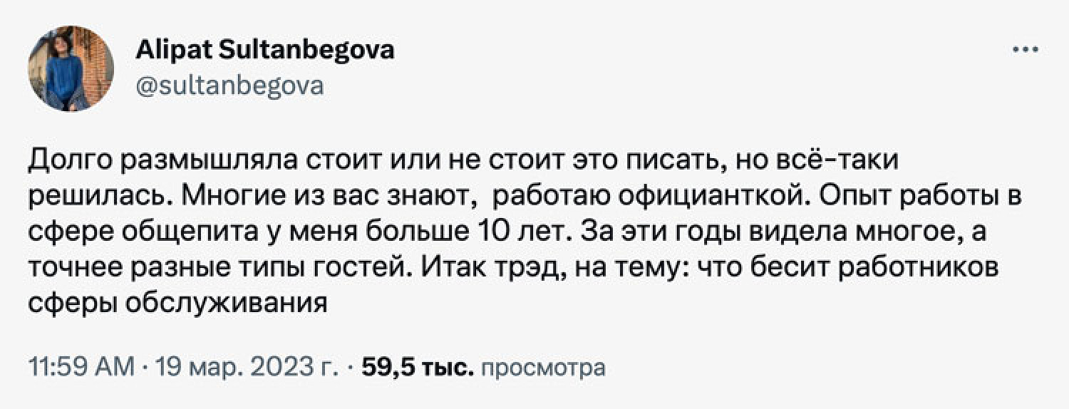 Спустя несколько дней своим опытом поделилась @sultanbegova — по словам девушки, она более десяти лет проработала в общепите и может рассказать, «что бесит работников сферы обслуживания».