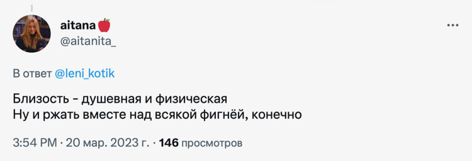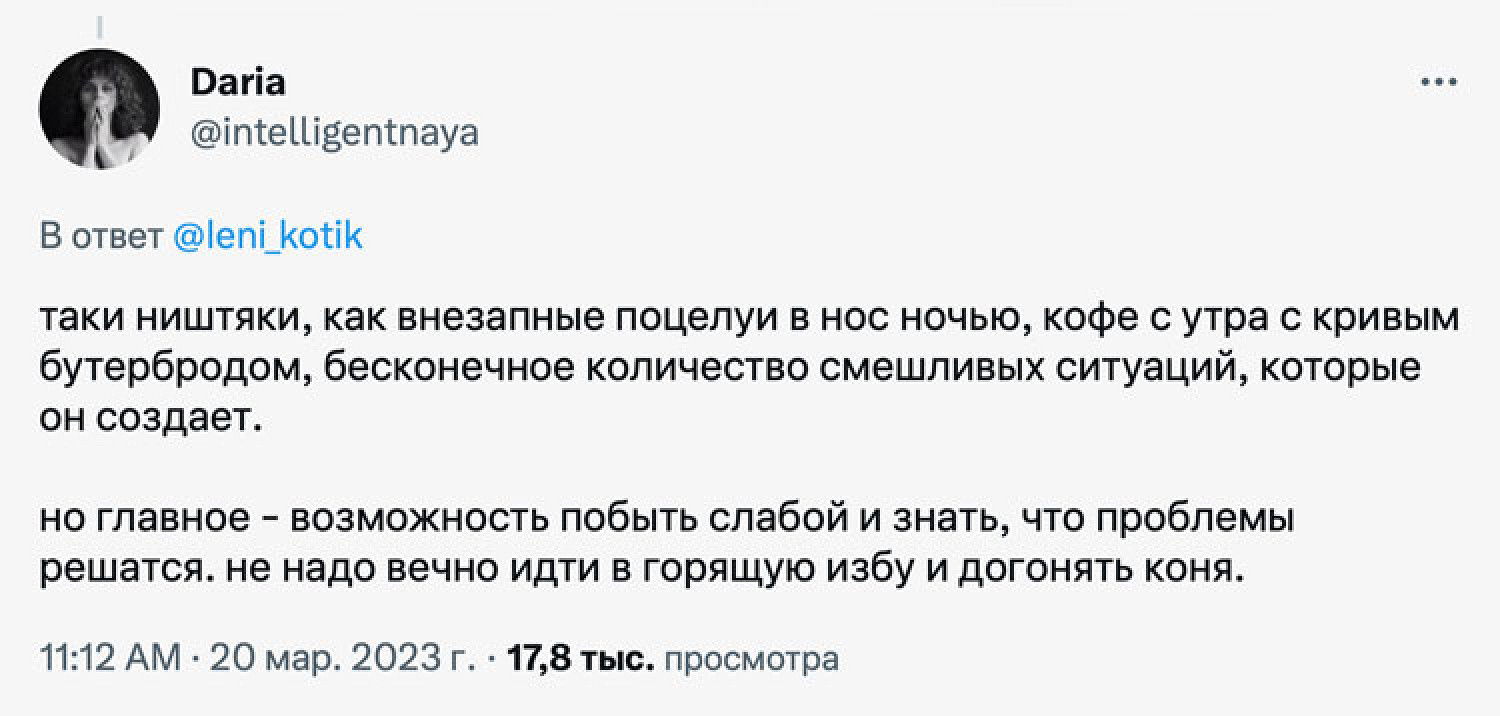 Комментаторы отмечают важность эмоциональной связи — она дарит им чувство спокойствия и безопасности: «могу прийти к мужу, он меня обнимет, и все сразу так хорошо становится», — пишет @jerryrrum. Многие вспоминают повседневные мелочи, из которых складывается радость от отношений: «поцелуи в нос ночью, кофе с утра с кривым бутербродом» или «совместные медитации» и возможность с кем‑то «побежать на семнадцатый этаж смотреть на закат». Другие чувствуют, что рядом с партнером у них словно «заряжается [внутренняя] батарейка» и что нет страха проявлять слабость, потому что есть уверенность, что «проблемы решатся». «Не надо вечно идти в горящую избу и догонять коня», — так это описывает @intelligentnaya.