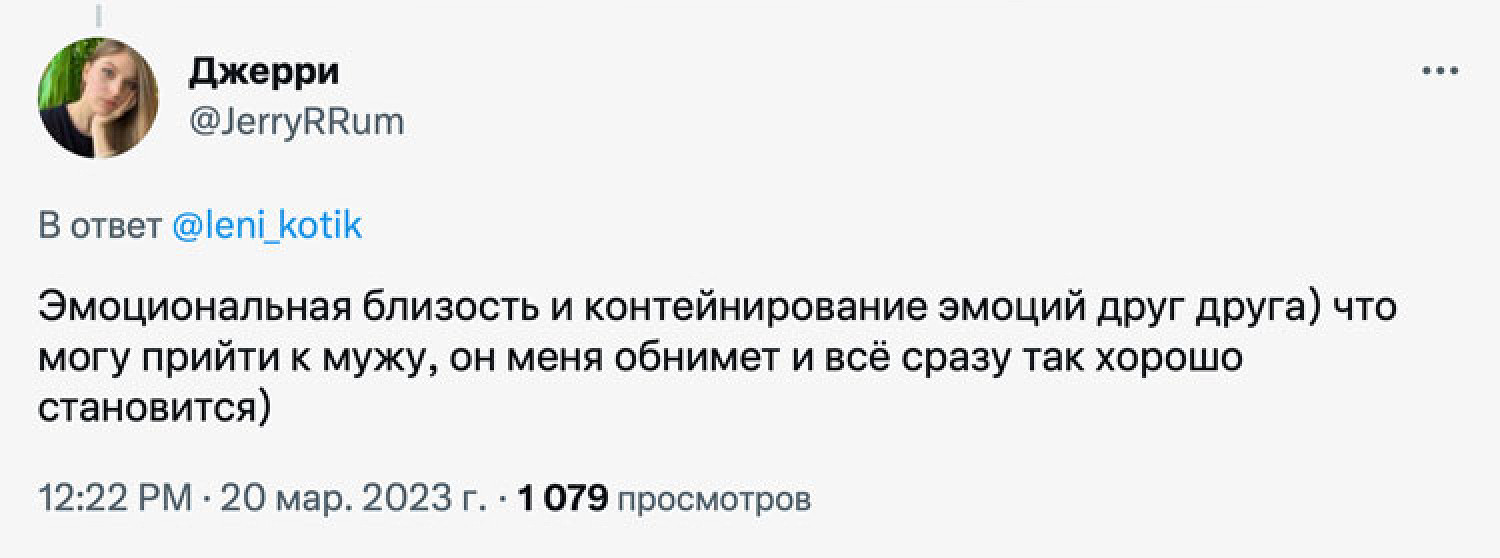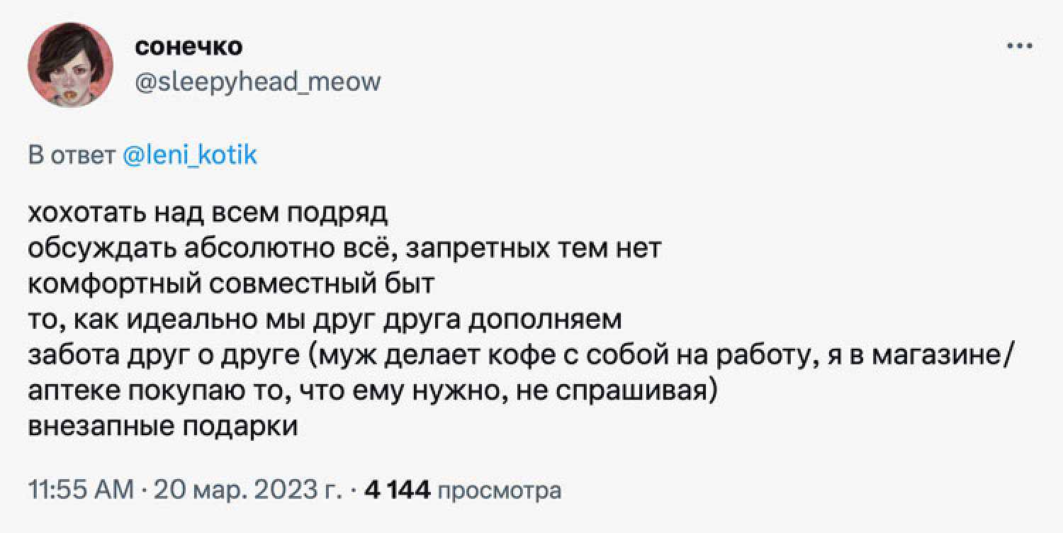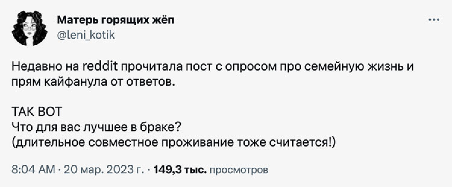 Пользовательница твиттера @leni_kotik встретила на реддите пост, где обсуждали семейную жизнь, и вдохновилась прочитанными там комментариями. Девушка решила собрать подобные ответы русскоязычных читателей и попросила подумать над вопросом «Что для вас лучшее в браке?», уточняя, что длительное совместное проживание с партнером тоже считается. За сутки под твитом появились сотни откликов, в которых пользователи делятся тем, что считают самым приятным в своих отношениях.