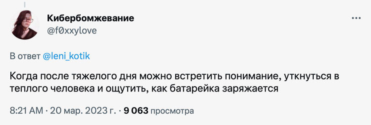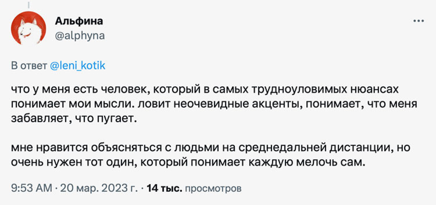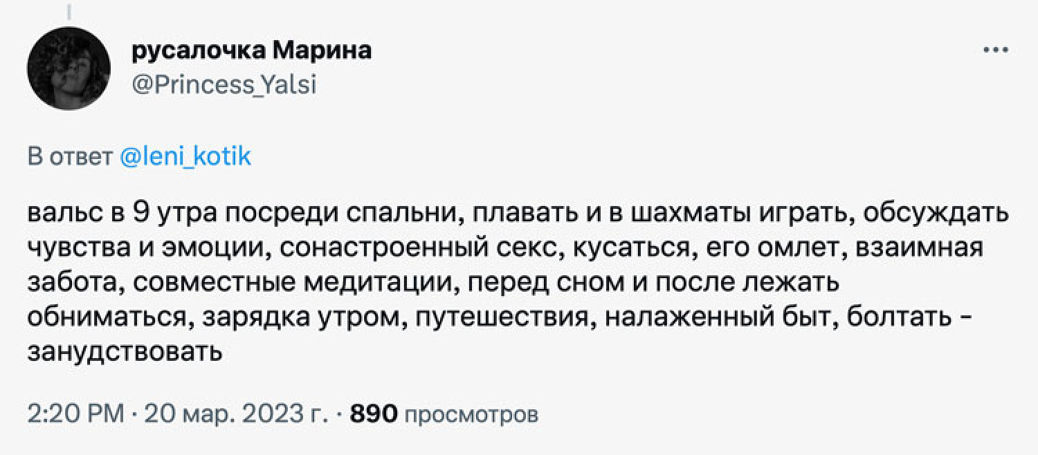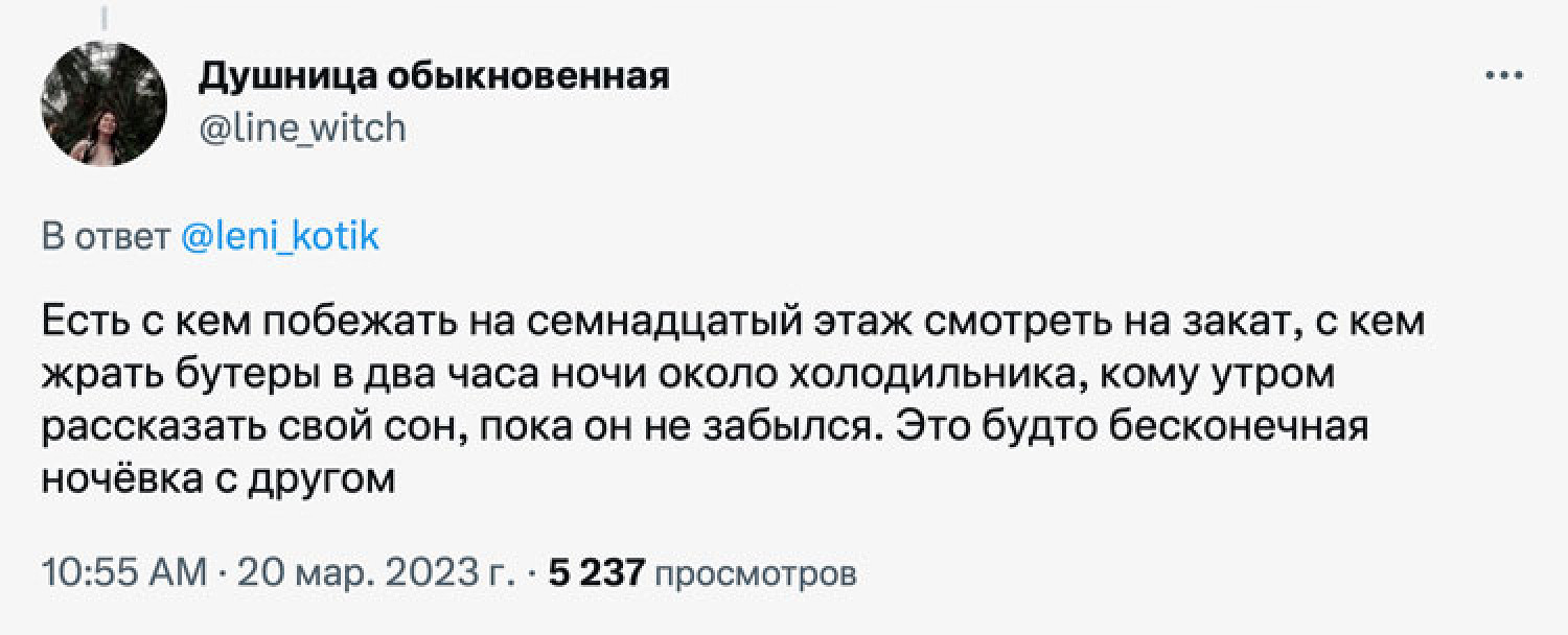Пользовательница твиттера @leni_kotik встретила на реддите пост, где обсуждали семейную жизнь, и вдохновилась прочитанными там комментариями. Девушка решила собрать подобные ответы русскоязычных читателей и попросила подумать над вопросом «Что для вас лучшее в браке?», уточняя, что длительное совместное проживание с партнером тоже считается. За сутки под твитом появились сотни откликов, в которых пользователи делятся тем, что считают самым приятным в своих отношениях.