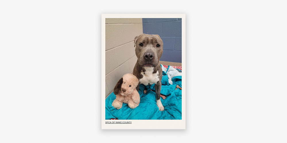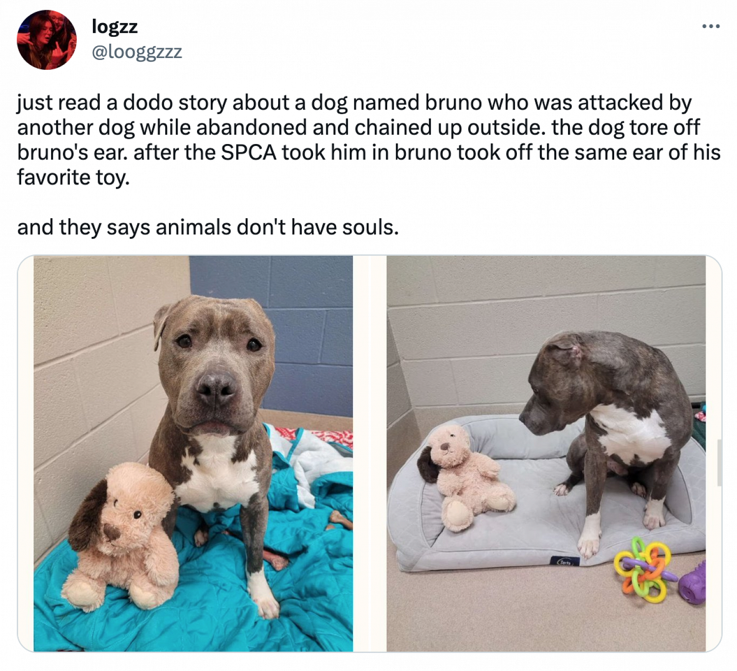 Жизнь питбультерьера Бруно из Северной Каролины не была простой: щенок долгое время жил на улице, страдал от холода и наверняка недоедал. А однажды на него напала другая собака, и в результате жестокой драки Бруно потерял ухо. К счастью, потом он попал в руки Общества по предотвращению жестокого обращения с животными (SPCA), где о нем начали заботиться. У Бруно даже появилась собственная любимая игрушка — небольшой плюшевый щенок. В какой‑то момент опекуны собаки заметили, что у игрушечного животного тоже не хватает левого уха — возникает мысль, что питбультерьер захотел, чтобы тот был похож на него.