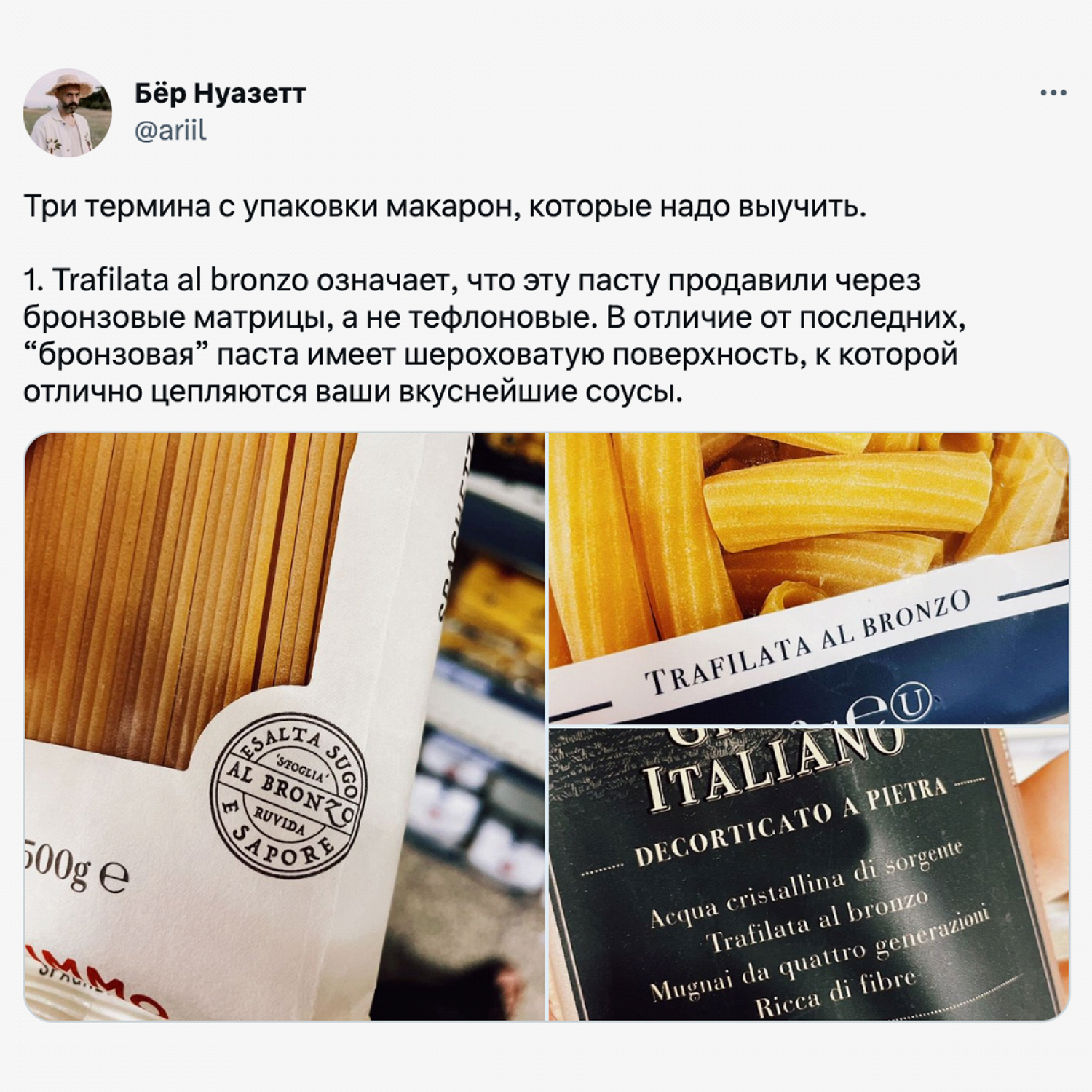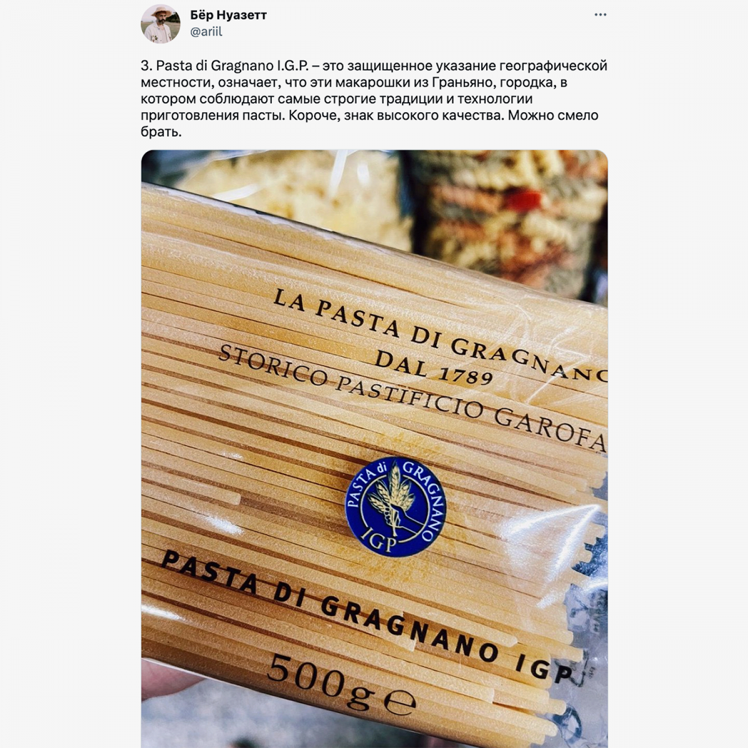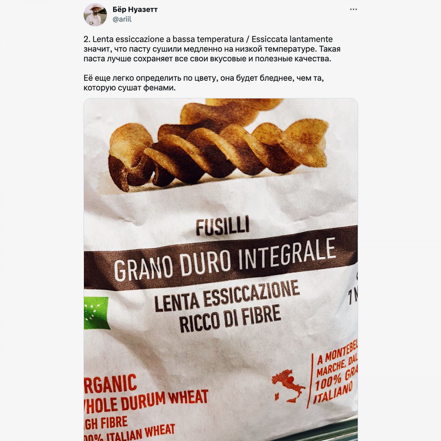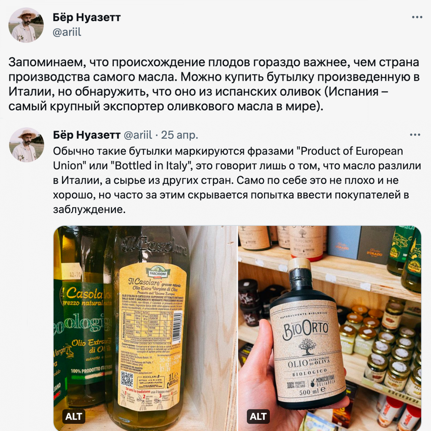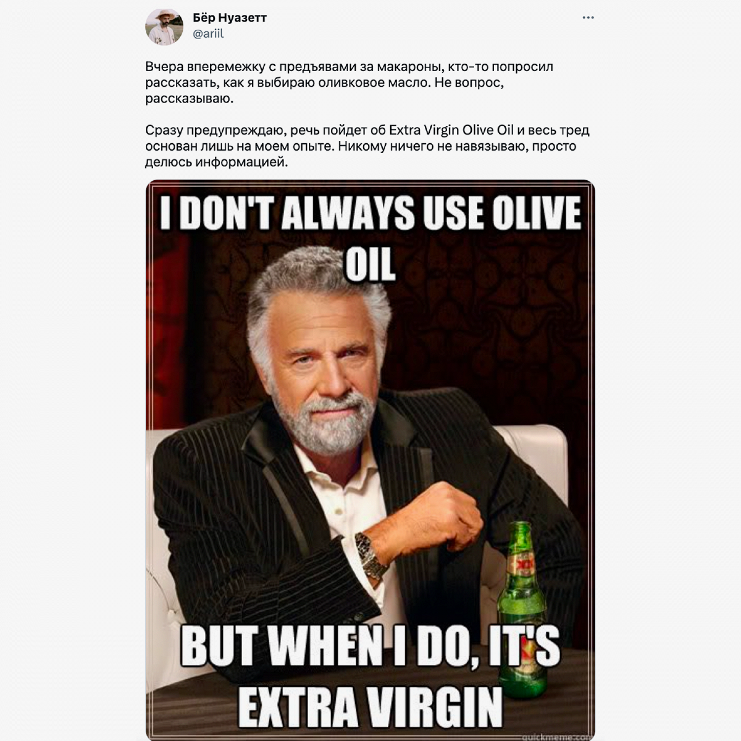Тред с макаронами набрал более 7000 отметок «Нравится», и через несколько дней @ariil опубликовал новый тред — на этот раз он рассказал, по каким критериям выбирает оливковое масло.