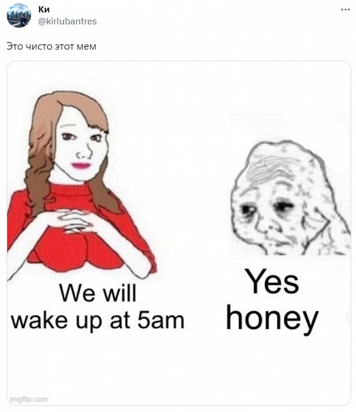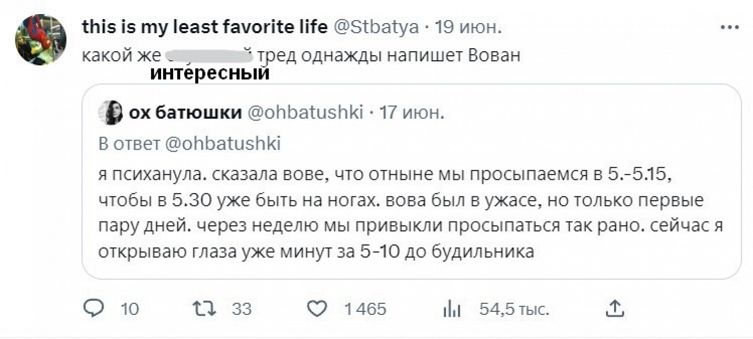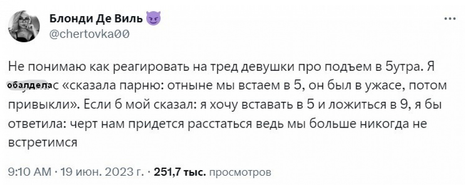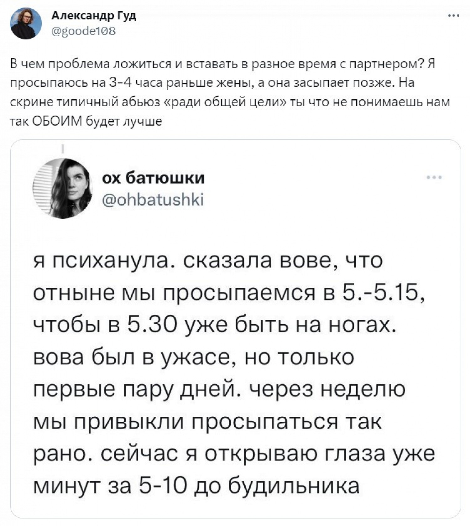 В твиттере завирусился тред пользовательницы с ником «Ох батюшки», в котором она рассказывает о своем ежедневном раннем подъеме. Читатели принялись обсуждать твит, в котором авторка рассказывает о своем молодом человеке, который теперь просыпается в пять утра вместе с ней.