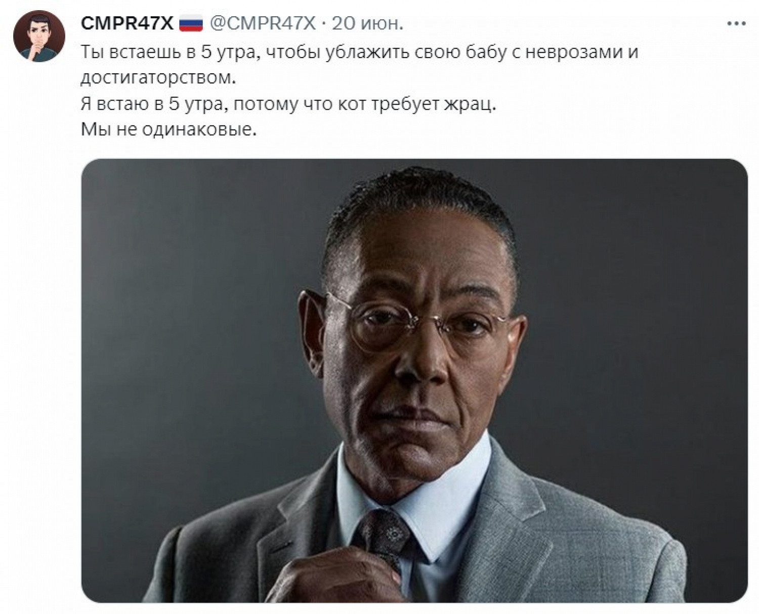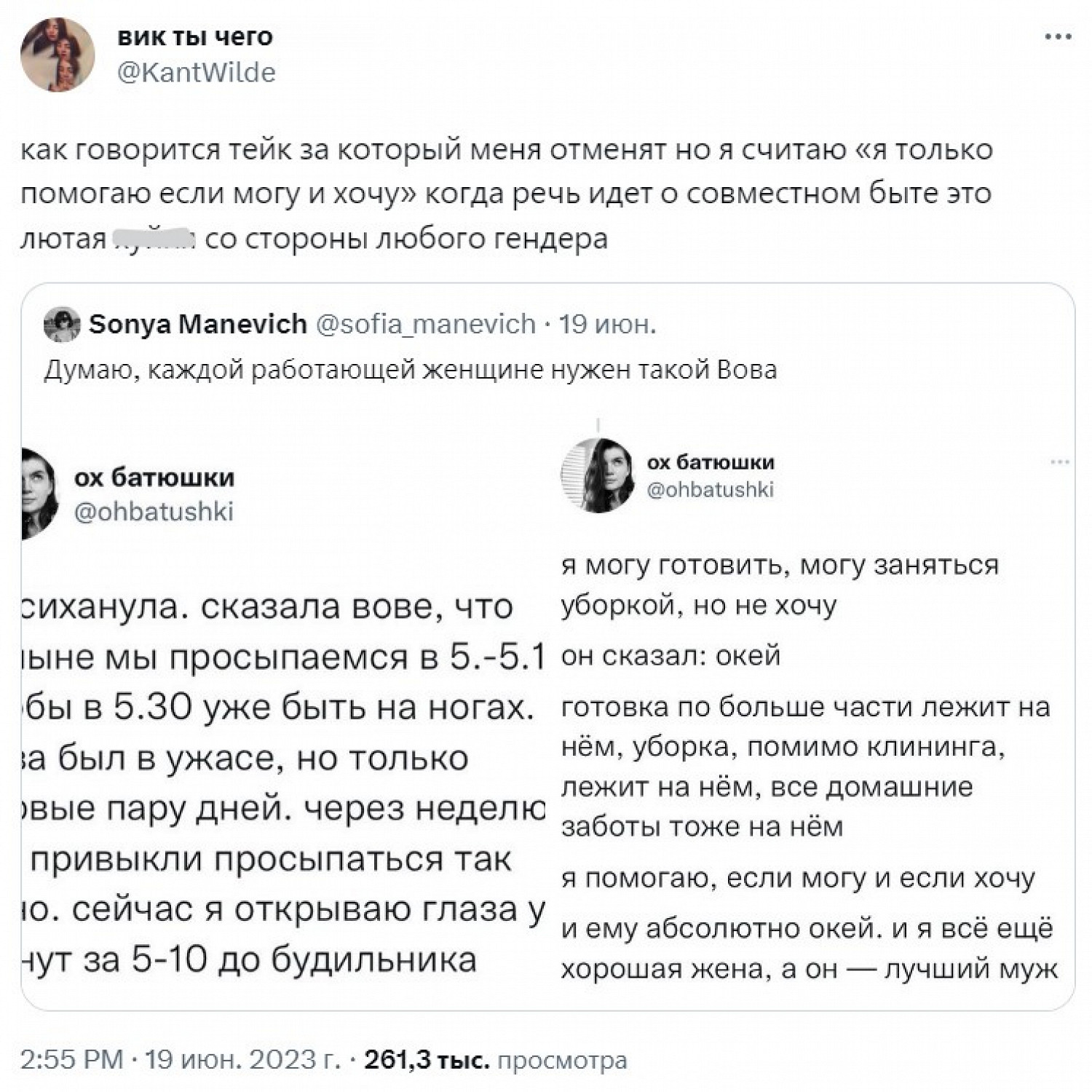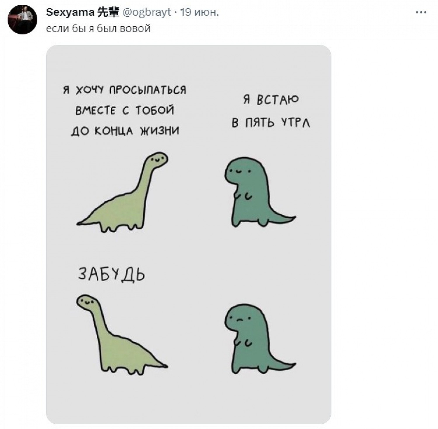 В твиттере завирусился тред пользовательницы с ником «Ох батюшки», в котором она рассказывает о своем ежедневном раннем подъеме. Читатели принялись обсуждать твит, в котором авторка рассказывает о своем молодом человеке, который теперь просыпается в пять утра вместе с ней.