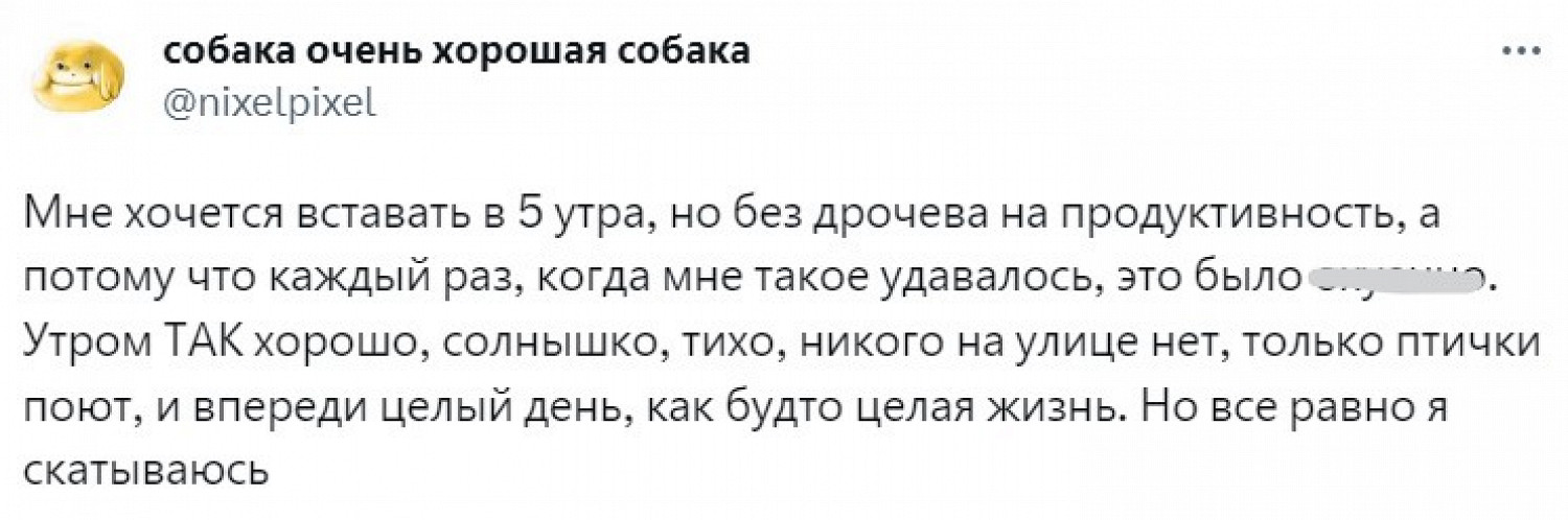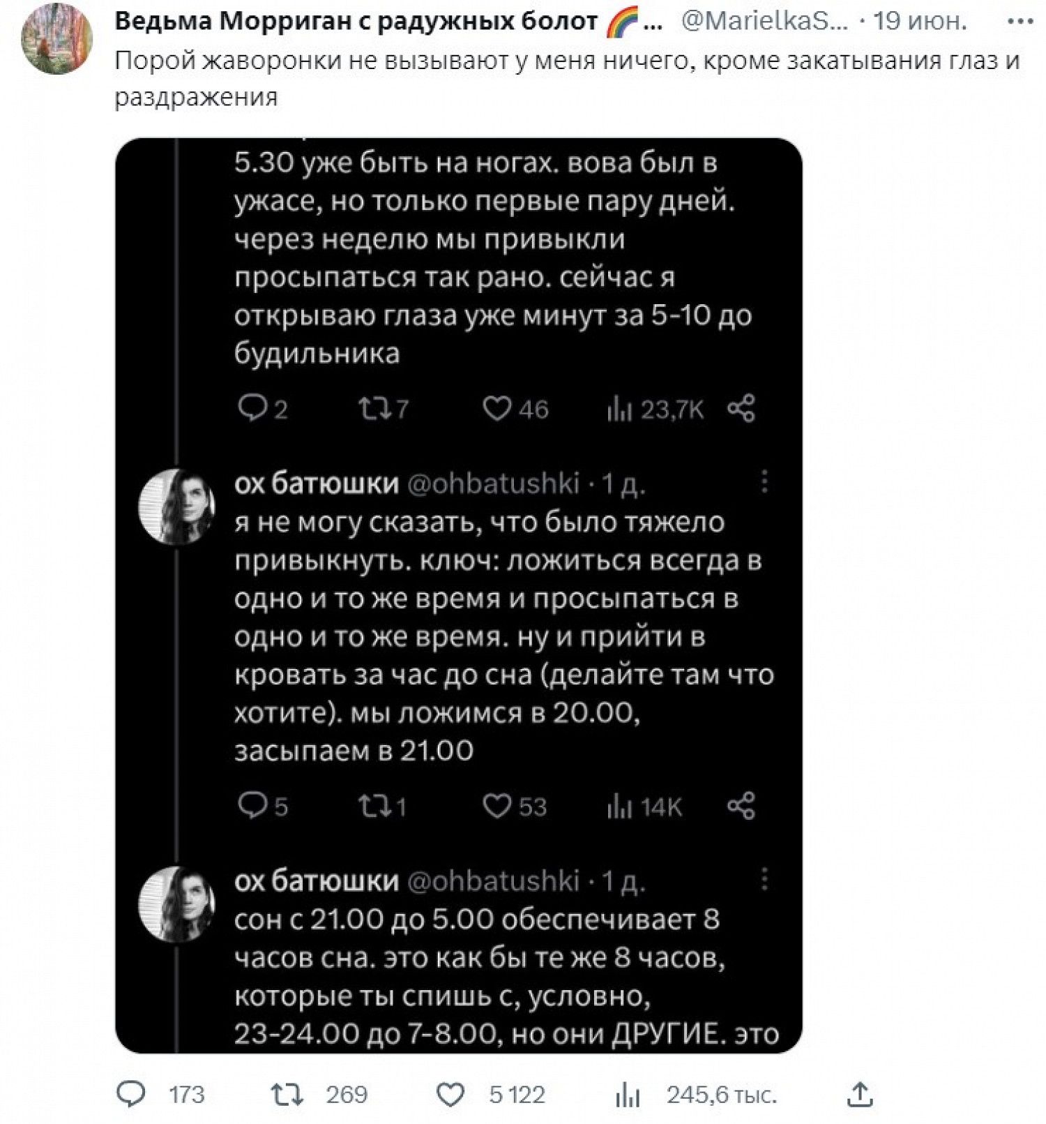 Вслед к обсуждению подключились те, кто не понимает, зачем начинать день спозаранку, и те, у кого это не получается. Они обнаружили и виновника раннего пробуждения — капитализм, который заставляет людей «вставать с рассветом, чтобы успевать еще как‑то саморазвиваться».